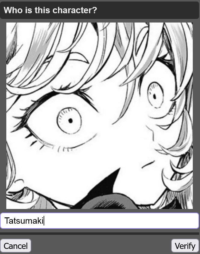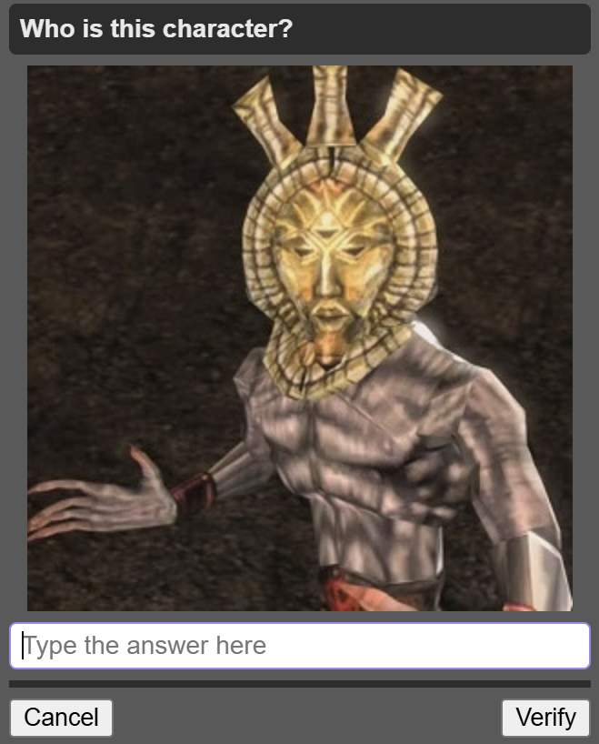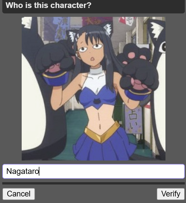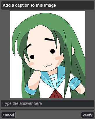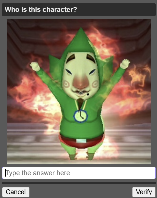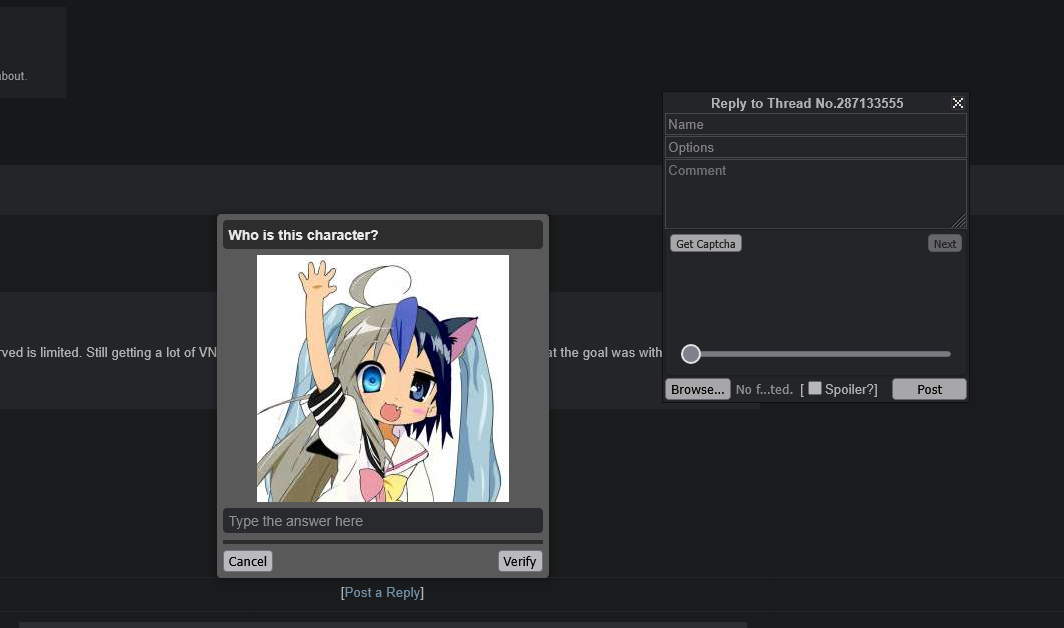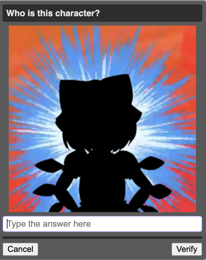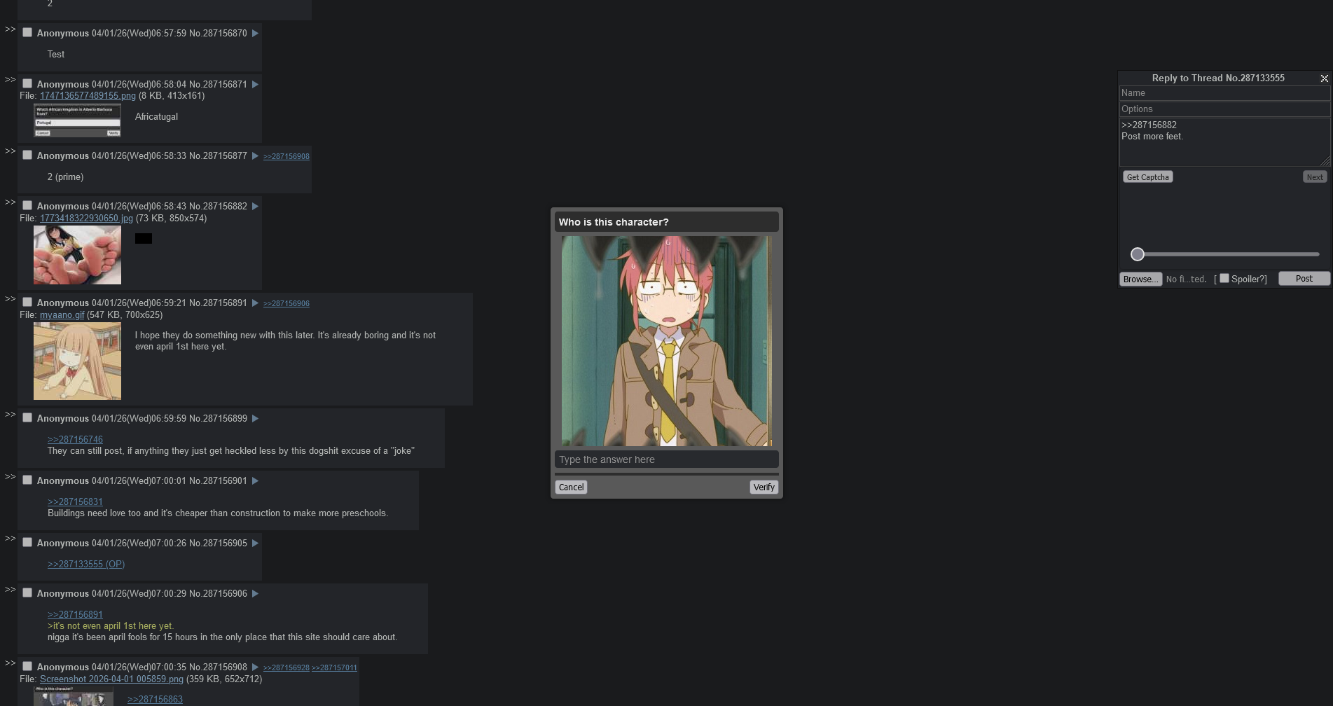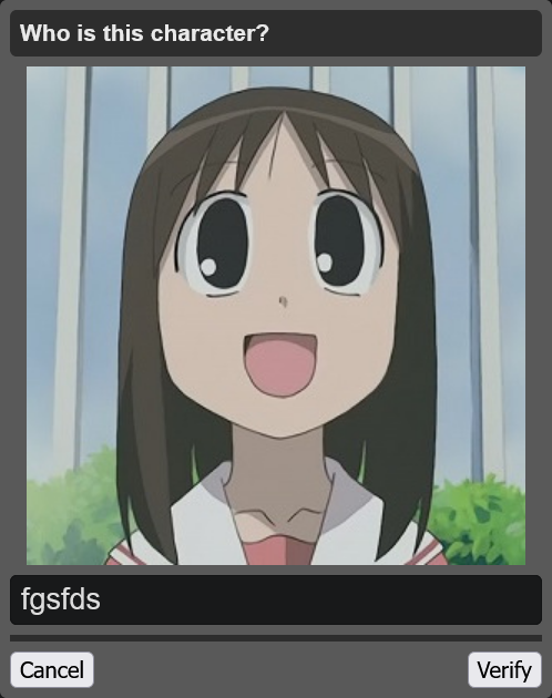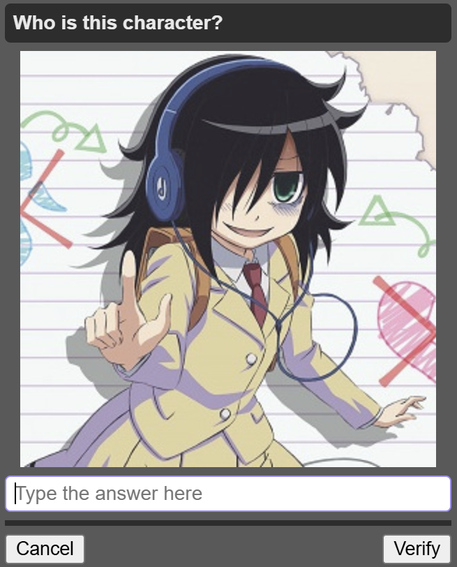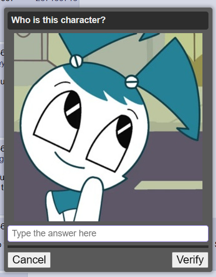 This April Fools feels more of just a petty attempt to make one for the sake of having one, and using nostalgiabait for it.>board cultureI'm afraid most of these captchas aren't even board culture.I've gotten like 2 Essex, 2 Armstrong, 2 Essex, 1 Megumin, 1 Nyoron, 2 Tatsumaki, 1 Kobeni, 1 Speedwagon, 1 /int/, and 1 Pomni so far. Even babbies can answer these.