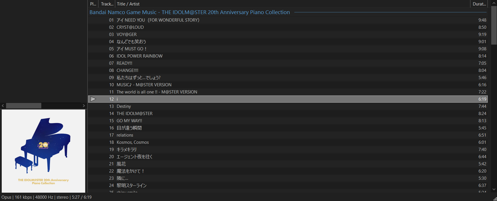 https://o.uguu.se/GYqBOiKc.torrentOn March 28th 2026, Bandai Namco Game Music uploaded a 14½ hour long compilation consisting of piano renditions of all-time favorite iDOLM@STER tracks.It is available at https://www.youtube.com/watch?v=XIBI65gASOsThis torrent is a locally available archive of this upload. It was downloaded with -f bestaudio and the file has been untouched since then to preserve what lossy quality remains.The bitrate is around 160 kbps Opus.A (non-standard) cue sheet is included which makes individual tracks visible in some players. For example, it works just fine with my copy of foobar2000.If anyone wants to upload this anonymously to nyaa, I'd be much obliged.