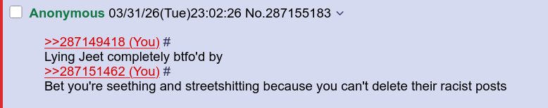 >>287149418Lying Jeet completely btfo'd by >>287151462Bet you're seething and streetshitting because you can't delete their racist posts