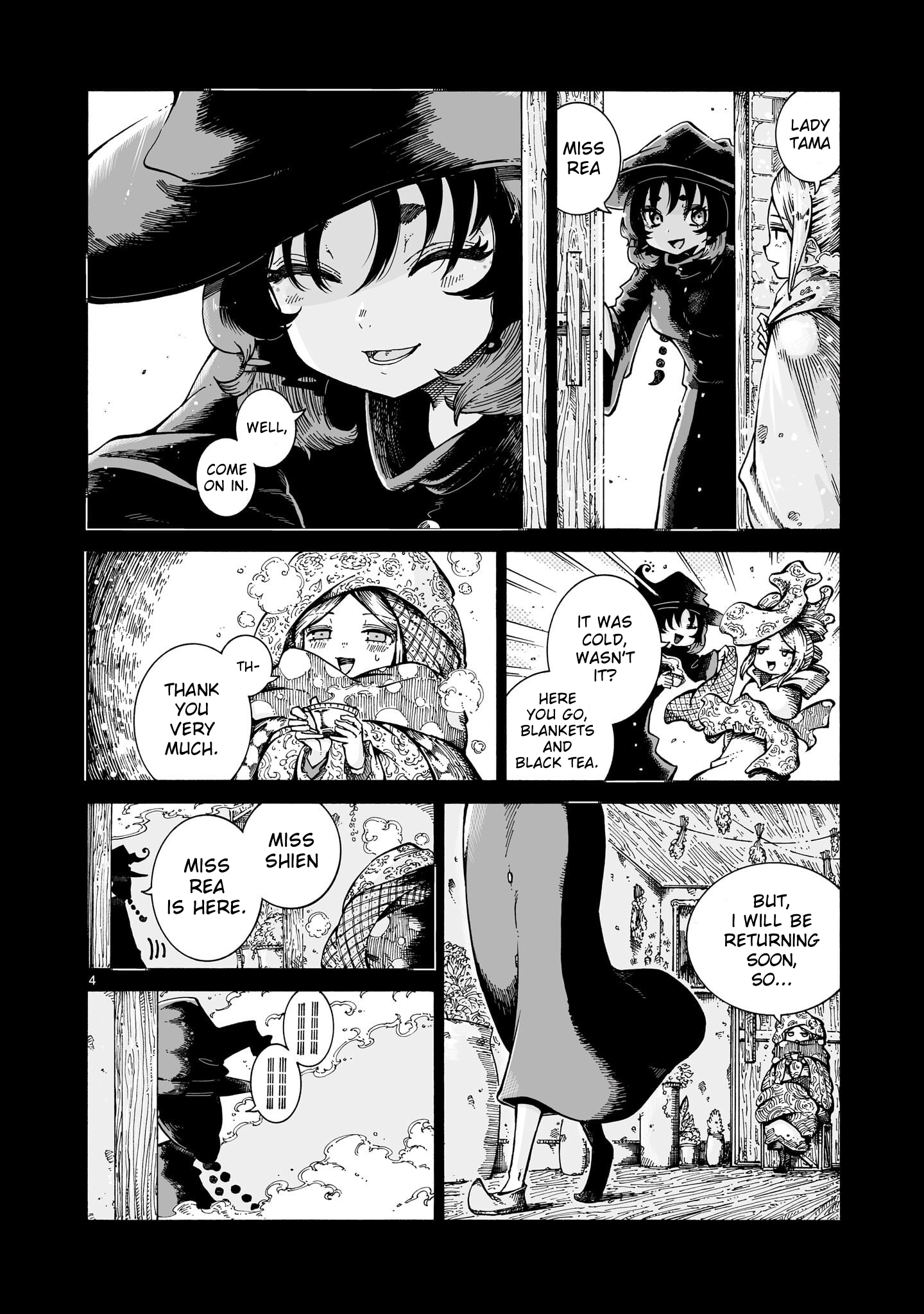 >Lady Tama>Miss Rea>Well>Come on in>It was cold, wasn't it?>Here you go, blankets and black tea(Black tea wasn't actually available in France until the next century)>Th->Thank you very much>But, I will be returning soon so...>Miss Shien>Miss Rea is here