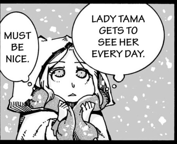 >When they will be needing gold again...>The last time was around half a year earlier so...>The next time is half a year later...>... It got cold all of a sudden>Lady Tama gets to see her everyday>It must be nice>Achoo>That's right>How about I come to return this scarf?