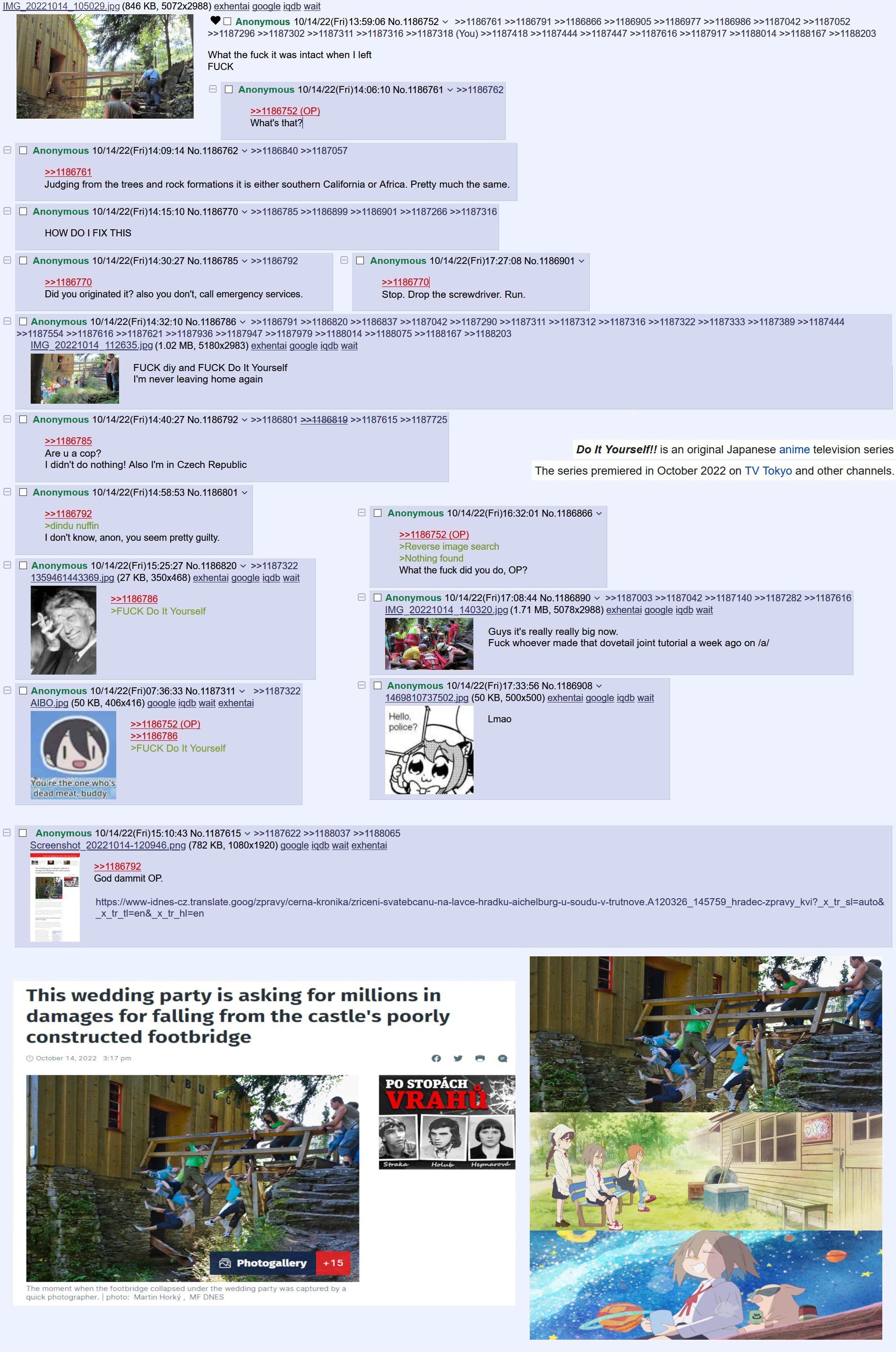 >>287175689Are you retarded? You start with a rope bridge scaffold to support construction and lift completed bridge segments into place with rope and pulleys anchored in firm ground. You don't just build outwards from the cliff like looney tunes.