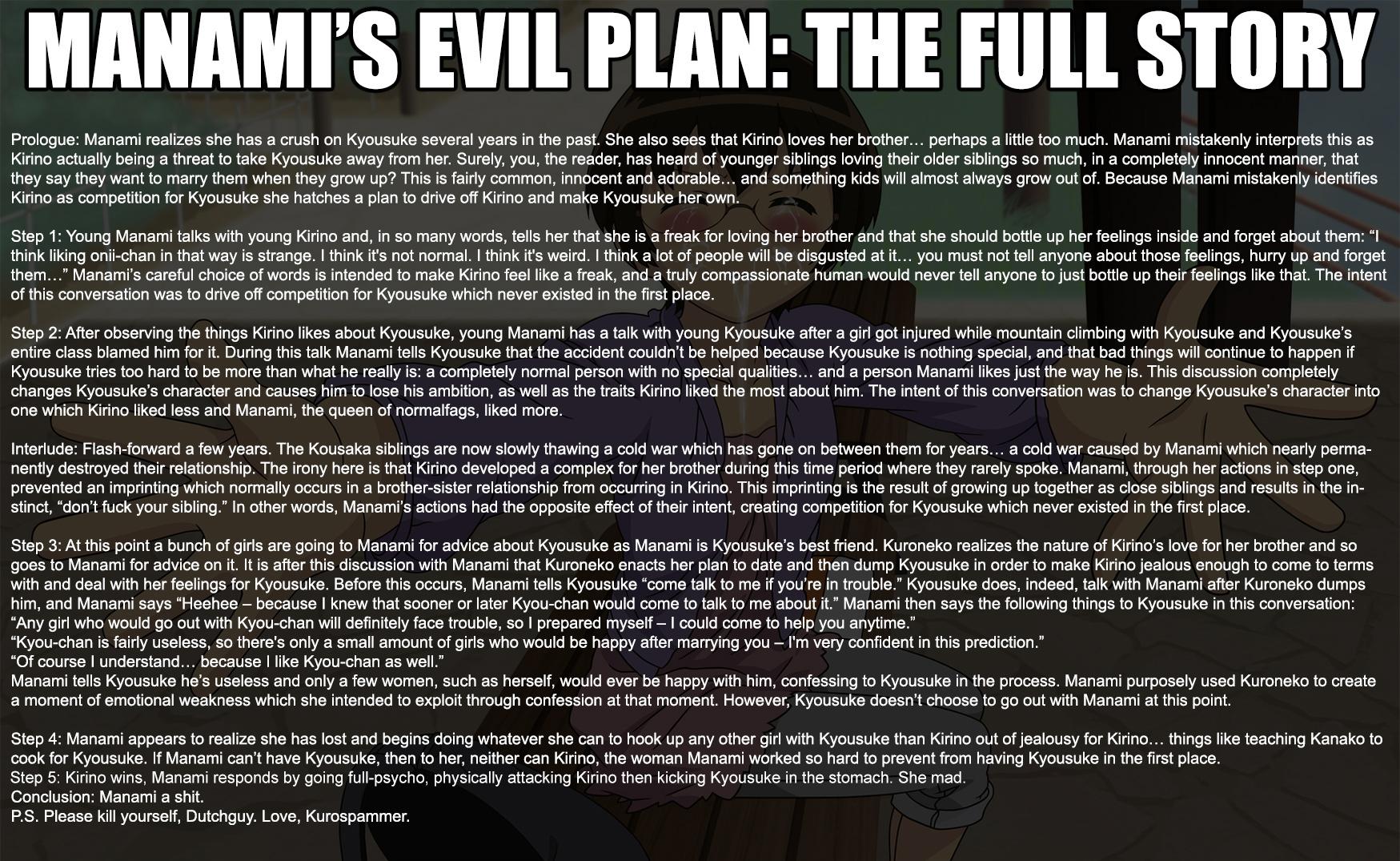 >>287189557She's the bad guy because she spent years putting down Kyosuke and manipulating him into mediocrity because she thought she was entitled to him as his CF, you illiterate fucking retard. She was also the arbiter of her own self-destruction by preventing Kirino from ever developing a healthy sibling relationship with her brother. You have to be retarded if you honestly think Manami told Kirino she was a freak out of the goodness of her heart. She did it to drive her away from Kyosuke and to hurt her.