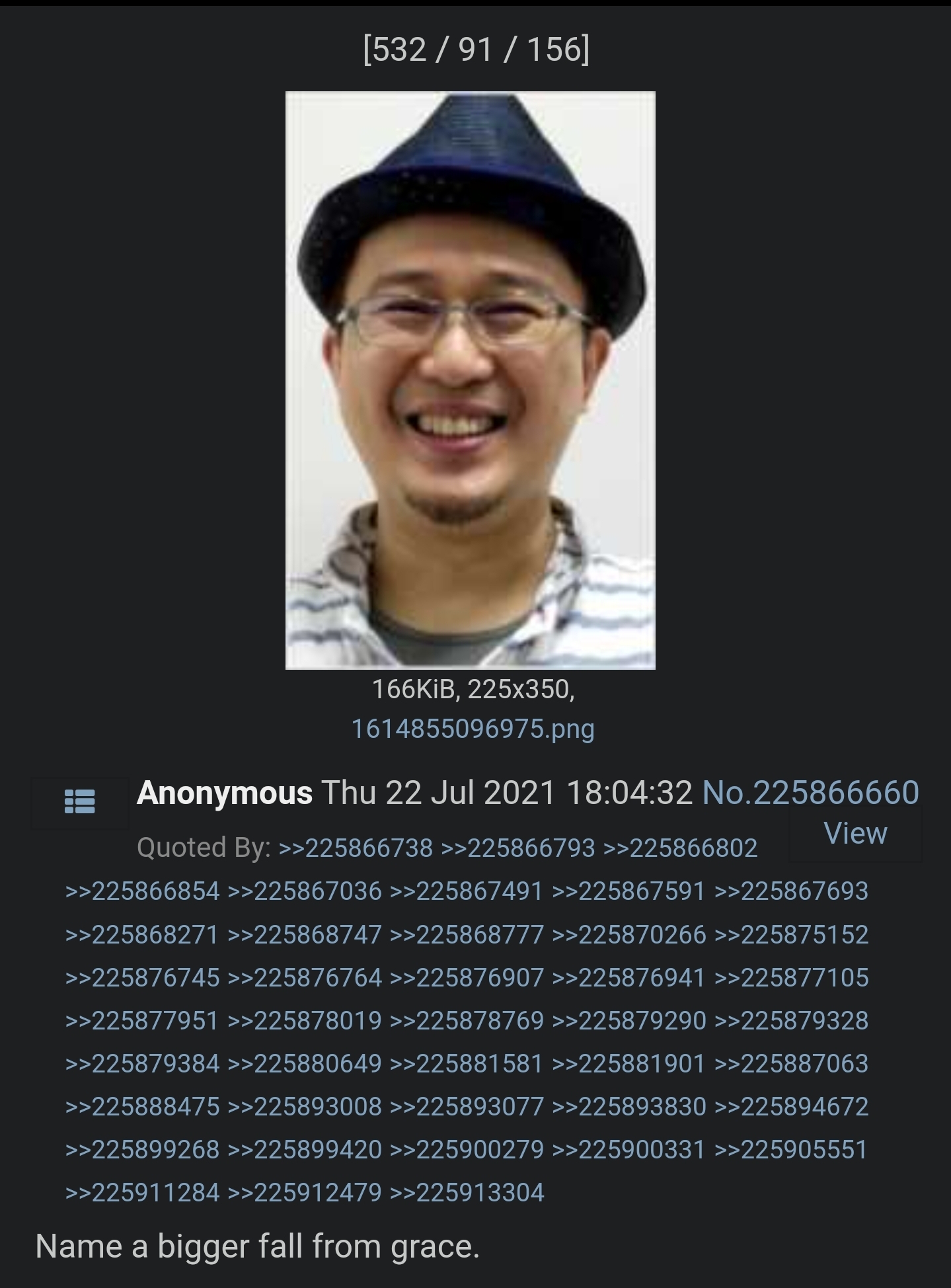 >>287185701Good, jail is where he belongs.He used to insist on /07/th threads that Rika wanting to grow up as an adult is just an "otaku joke". It seemed that he was more latched on to her design rather than on her character/personality