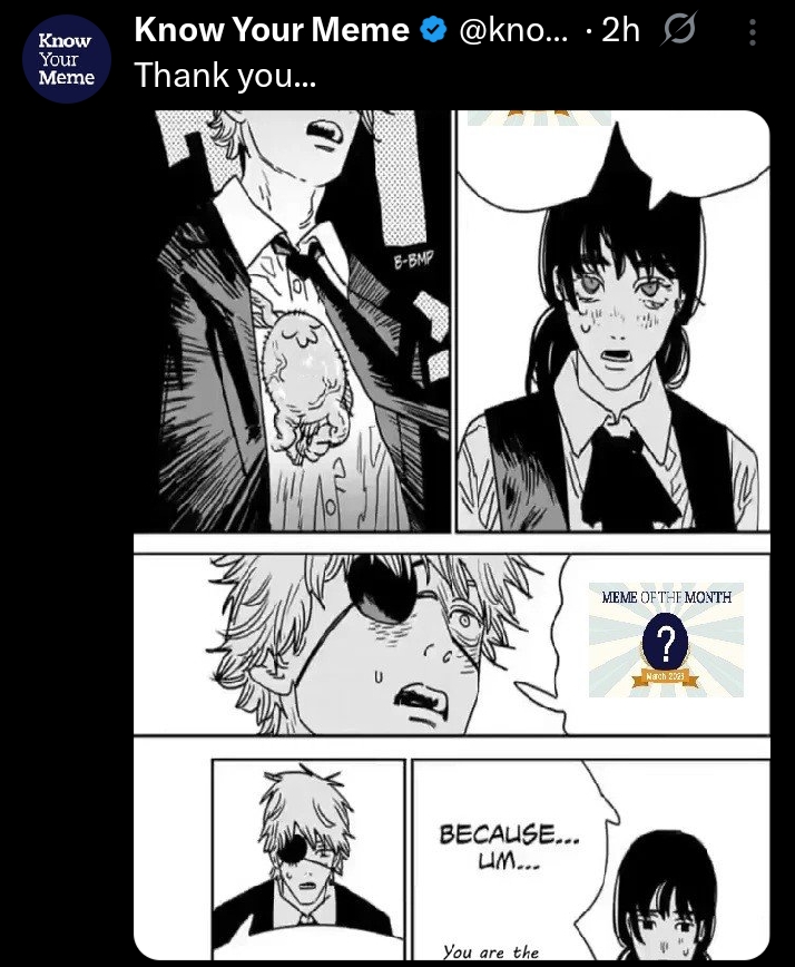 >>287193049Gear 5 failed to break the internet, Imu failed the break the internet, while Chainsaw Man got 2 super popular panels in a row, Why are we Chainsaw Gods so popular? MangaPlus had to move Chainsaw Man to the completed manga section immediately because it had 3 times the views of One Piece.