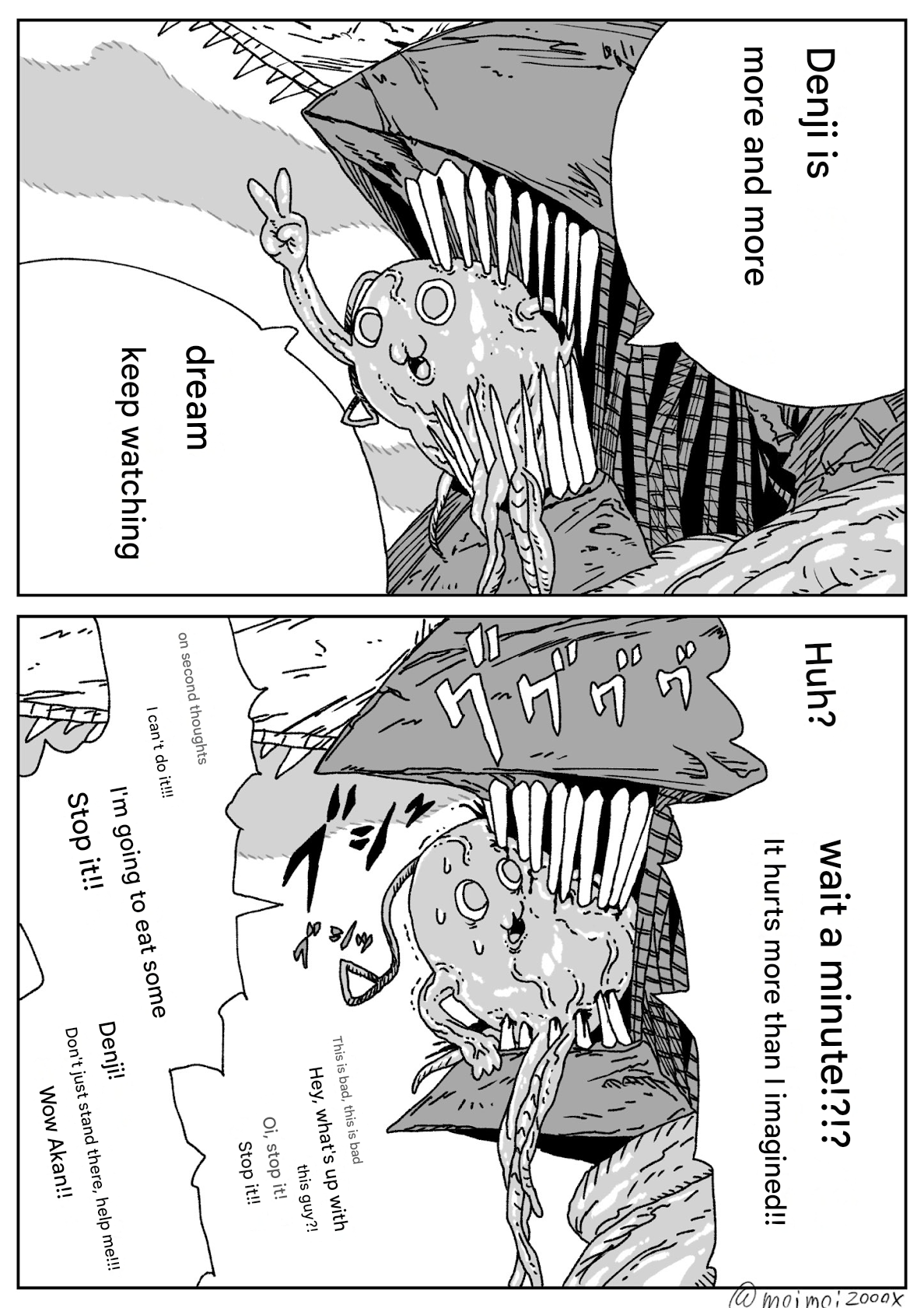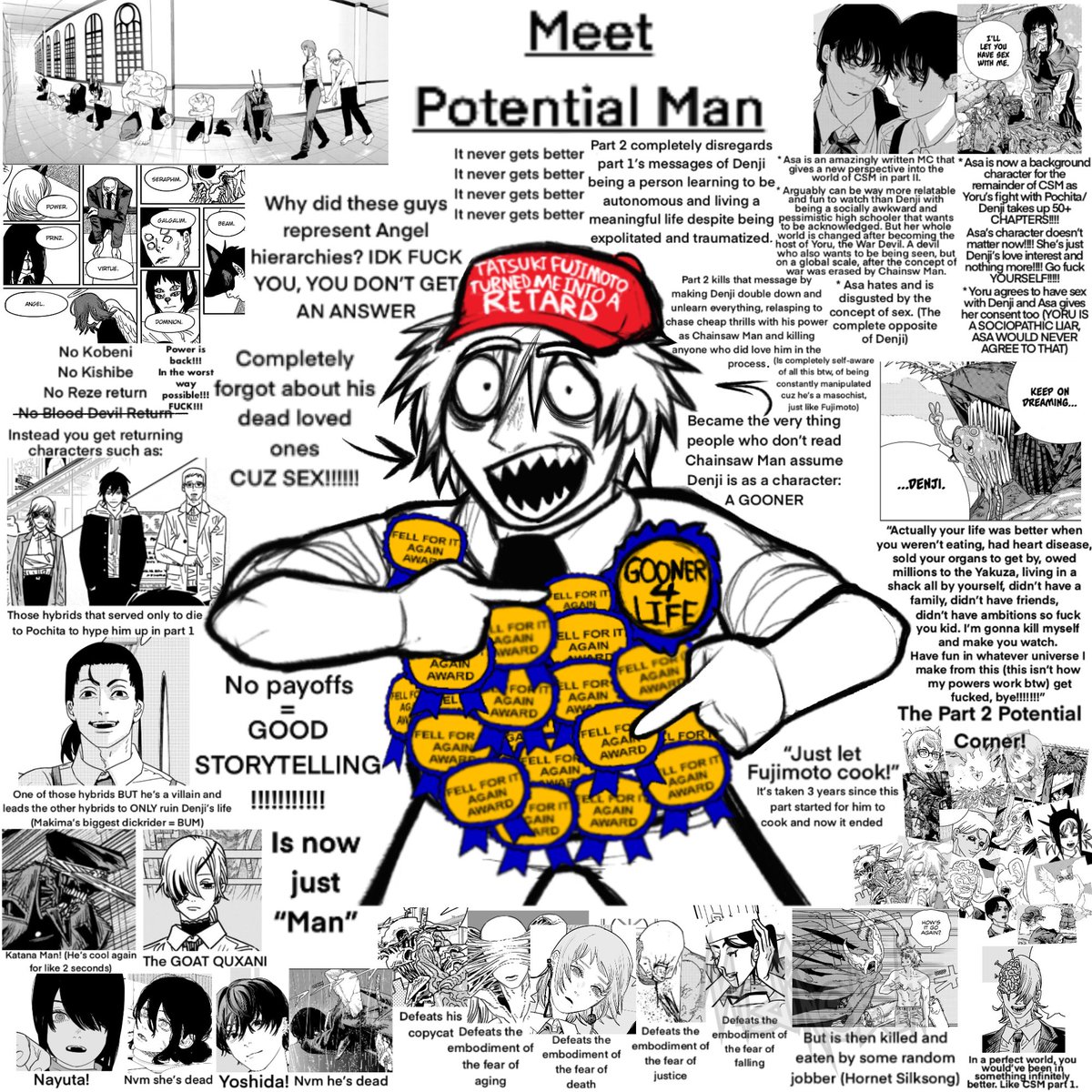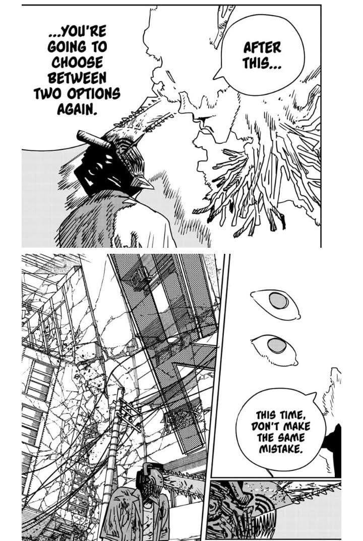 >>287191737Some readers of Part 2 got tricked by Yoshida, Barem and Fire into thinking that Pochita hated Denji, because they mistook Pochita worrying about the effect being Chainsaw Man had on Denji, something he had felt before, for Pochita saying that Denji ruined being Chainsaw Man with his incompetence.But again, these are the same people who thought Miri had a point and part 2 was anti-US.
