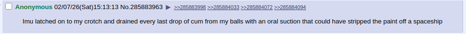 RIP to female Imu and all creativity, memes, shitposting and dedication to it, an era has ended.https://www.youtube.com/watch?v=o231fOo8cNg
