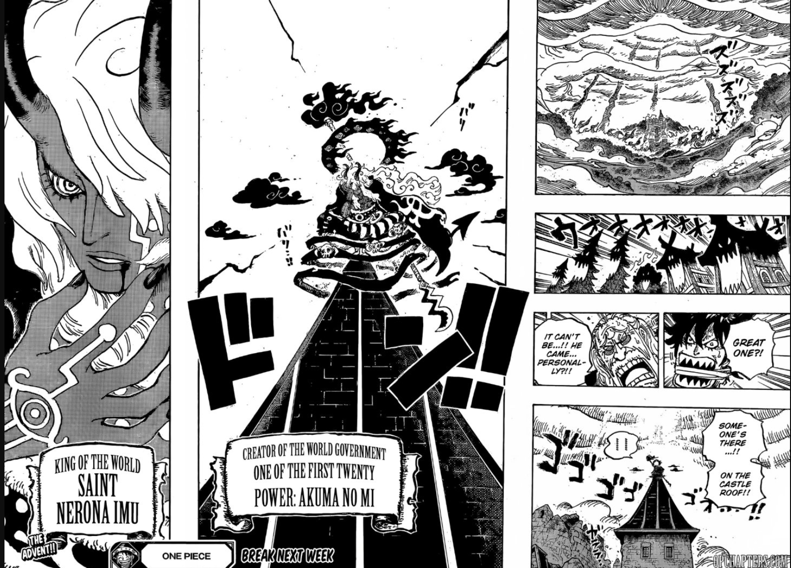 The revs have clearly started a war with the WG.Imu just left and Laffitte is sending all the intel to blackbeard. Devon will help blackbeard use the abyss circles and blackbeard will teleport straight to the flower room when Imu flees from Luffy and Loki, when his timer runs out. Then ZEHAHAHAAHAHA will strike and steal the devil fruit.