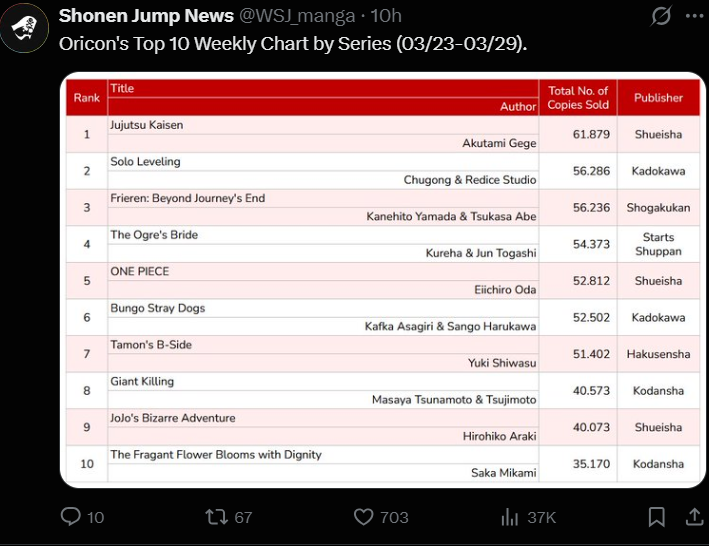 >>287233438Sales>2. Kagurabachi 10 - 1,687>8. Akane-banashi 20 - 141,428TOC>14.57 Kagurabachi>03.87 Akane-banashiKGB loses through and through, even the anime won't help it.