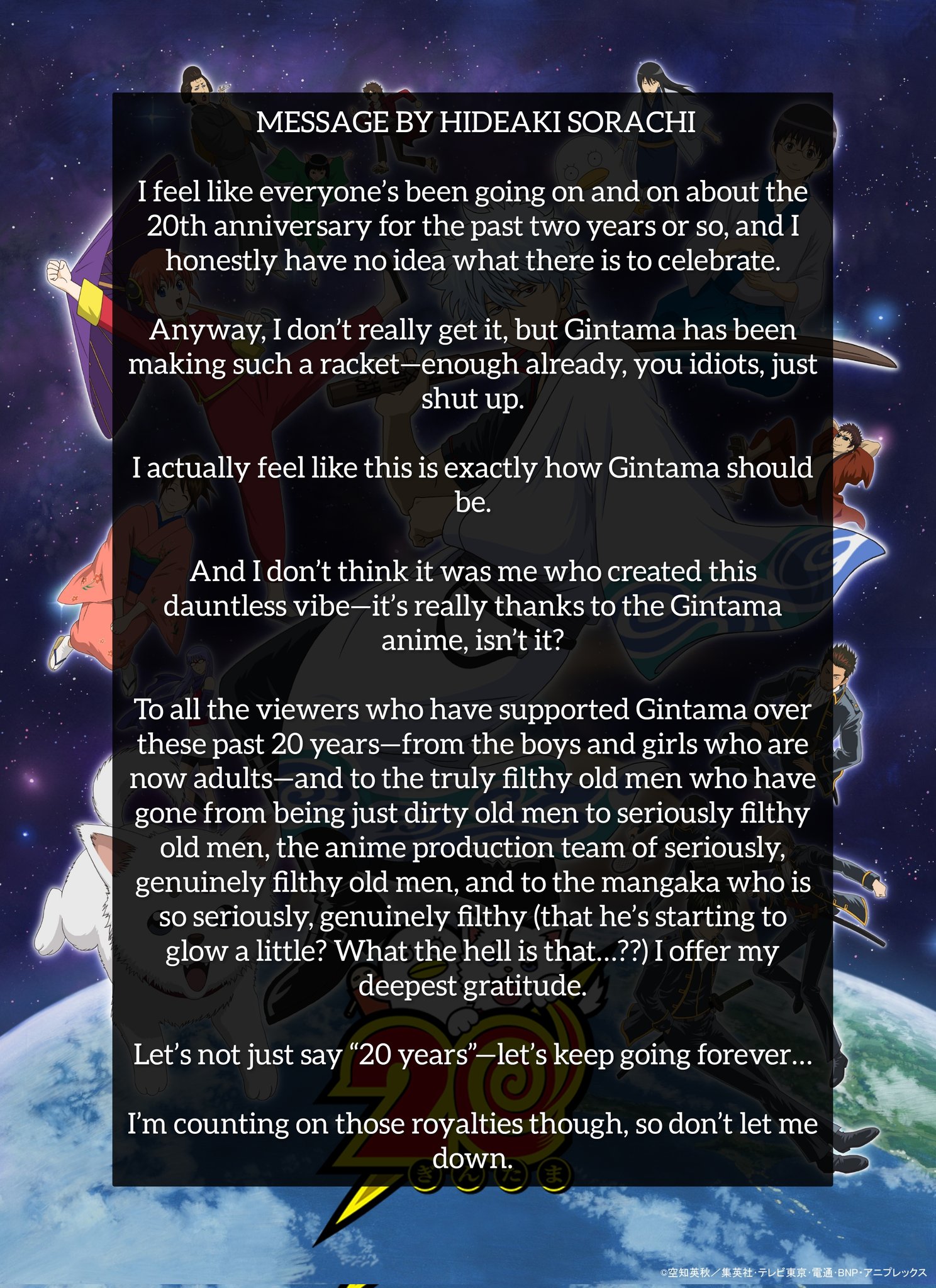 Sorachi about Gintama anime 20th anniversary