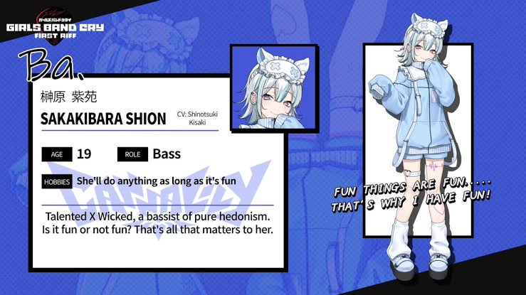 Face of each band: Tomori, SakikoHeart and soul of each band: Tomori, SakikoVocalists: Tomori, HatsuneMascot chara: Raana, MortisDay to day operations: Taki, Sakiko/UmiriSocial stuff: Anon, NyamuLeader: Tomori, Sakiko