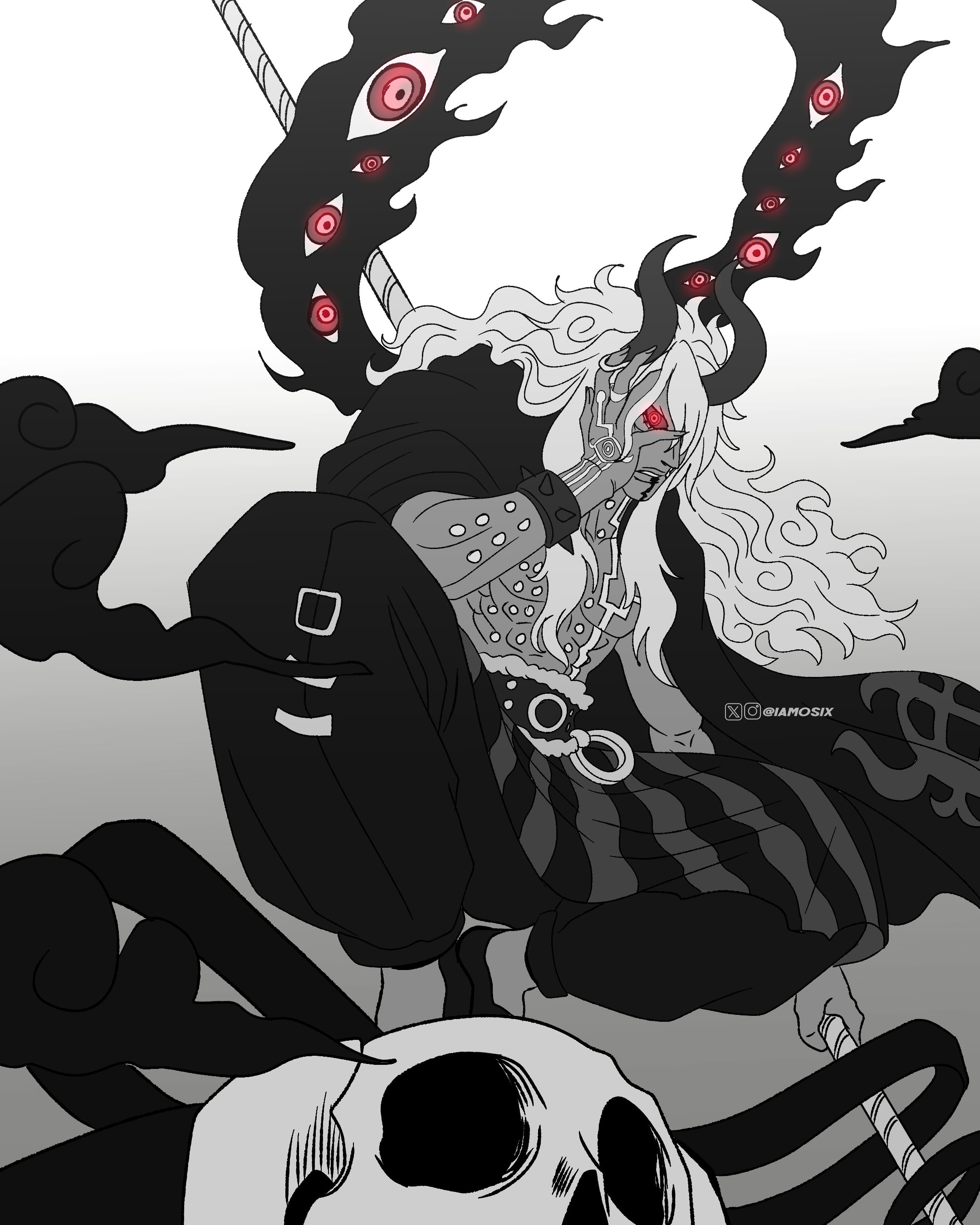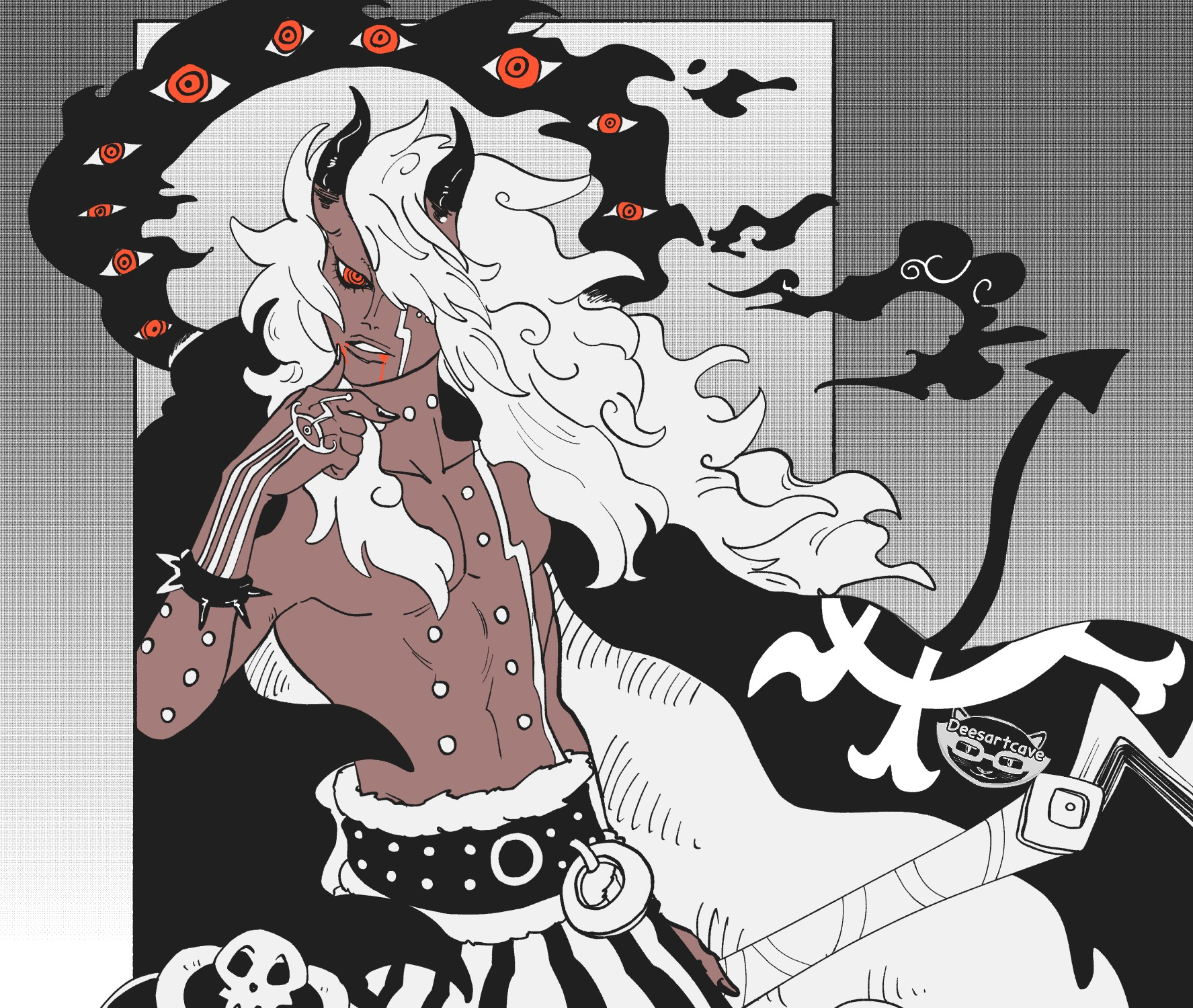 What's going on with those black lines? One seems to be connected to his tail(?) and has the 3 skulls on it but then there's a second one below that seems to just end in a tattered ribbon.