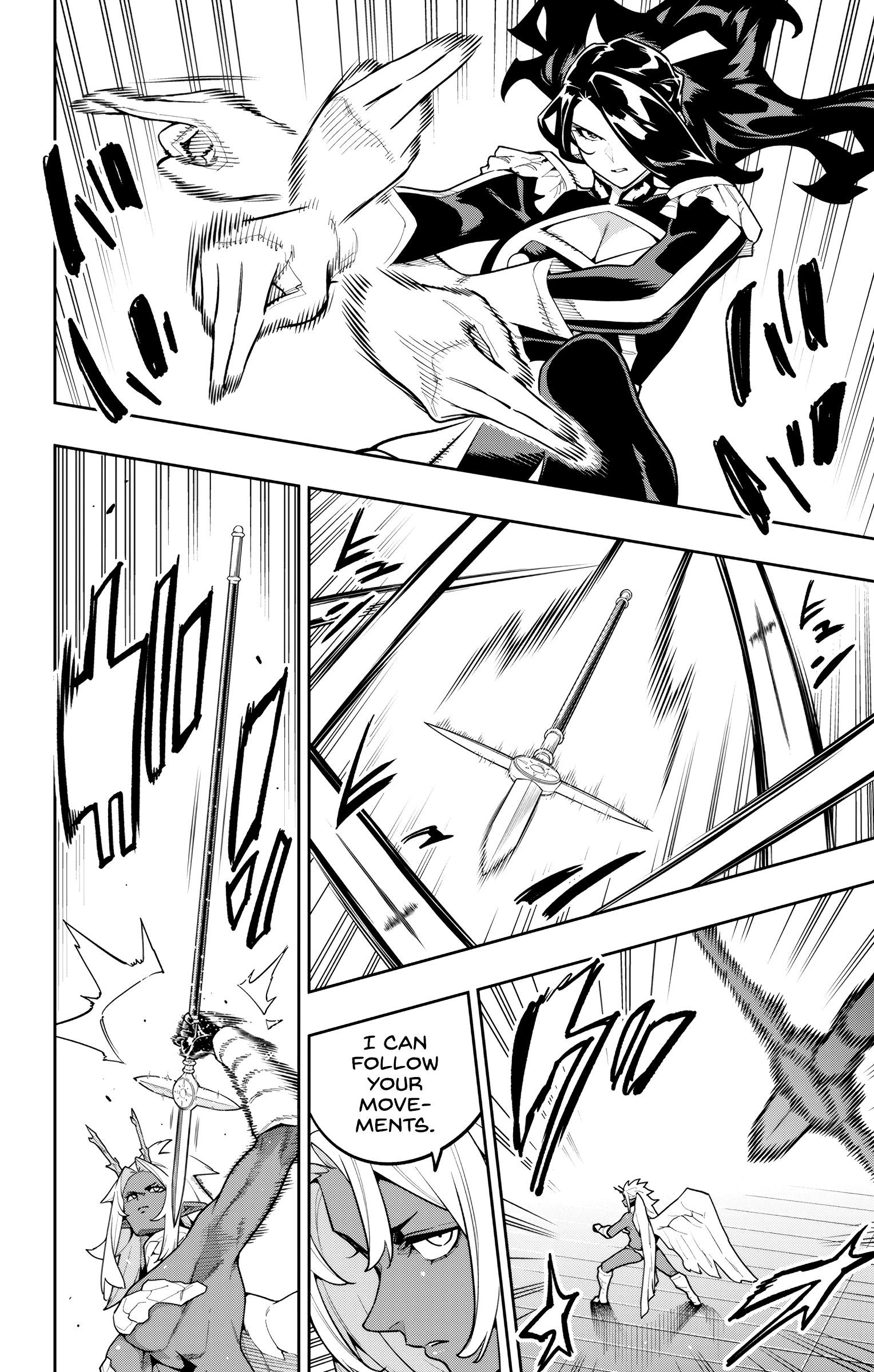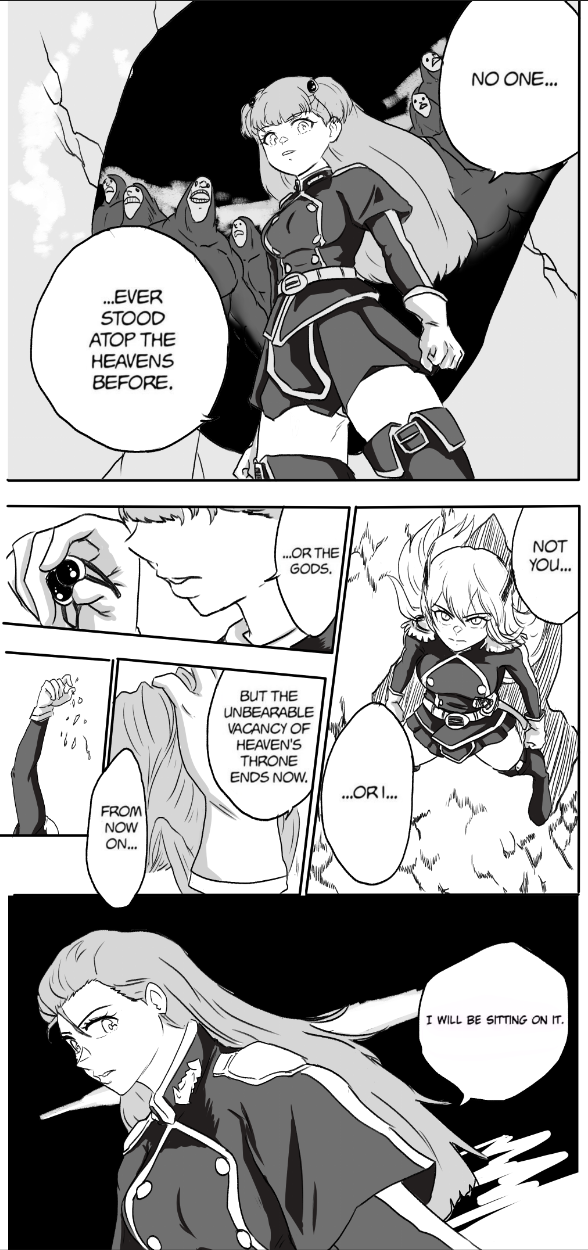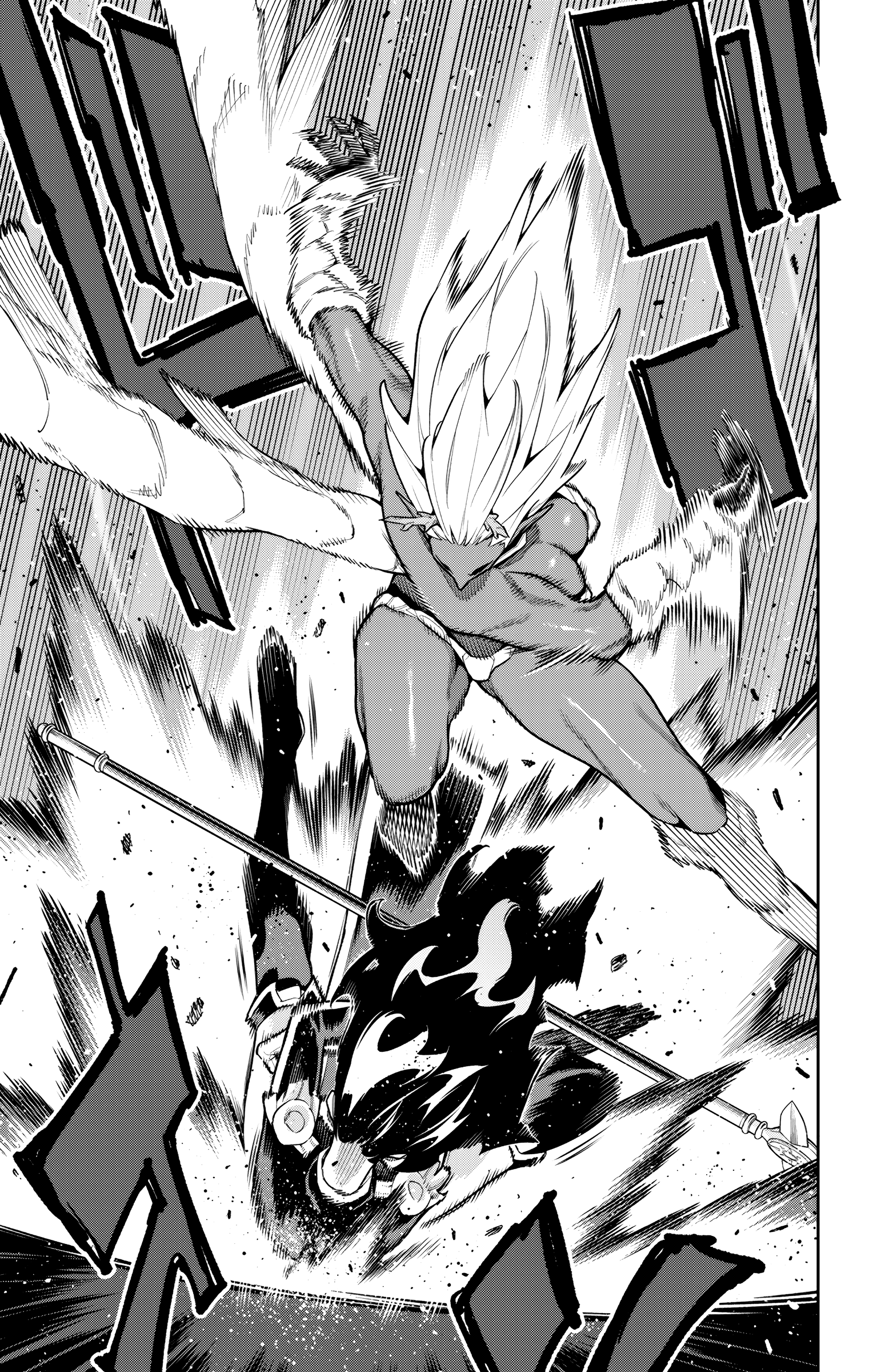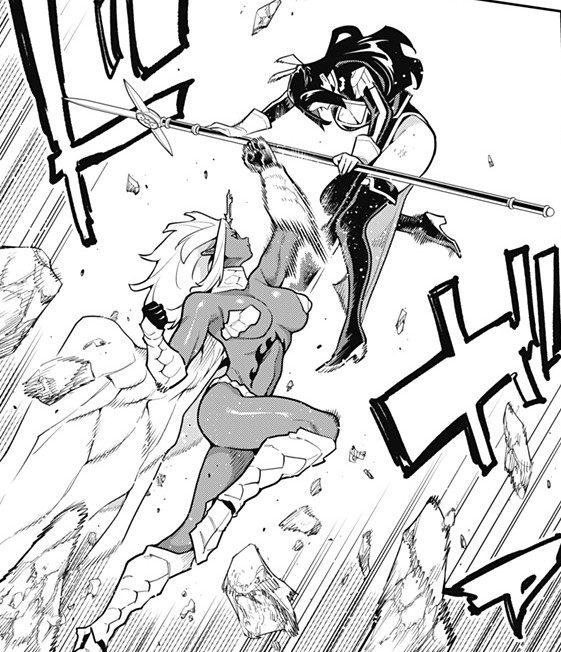 End of chapter.Damn, Jouryuu's a fucking beast handling three Chiefs at once and still getting the upperhand.Each Chief is severely injured and unless they have something else up their sleeves, I think they will lose this one.Jouryuu's physical might is just overwhelming.Although it might also be that she already knows the capabilities of the Chiefs beforehand that's why she's able to one-up them.The first two pages feel weird and misplaced but I keep on thinking that they might be death flags.Also remember that Fubuki wished for this matchup, she better have something ready and not just spear thrusts or else...