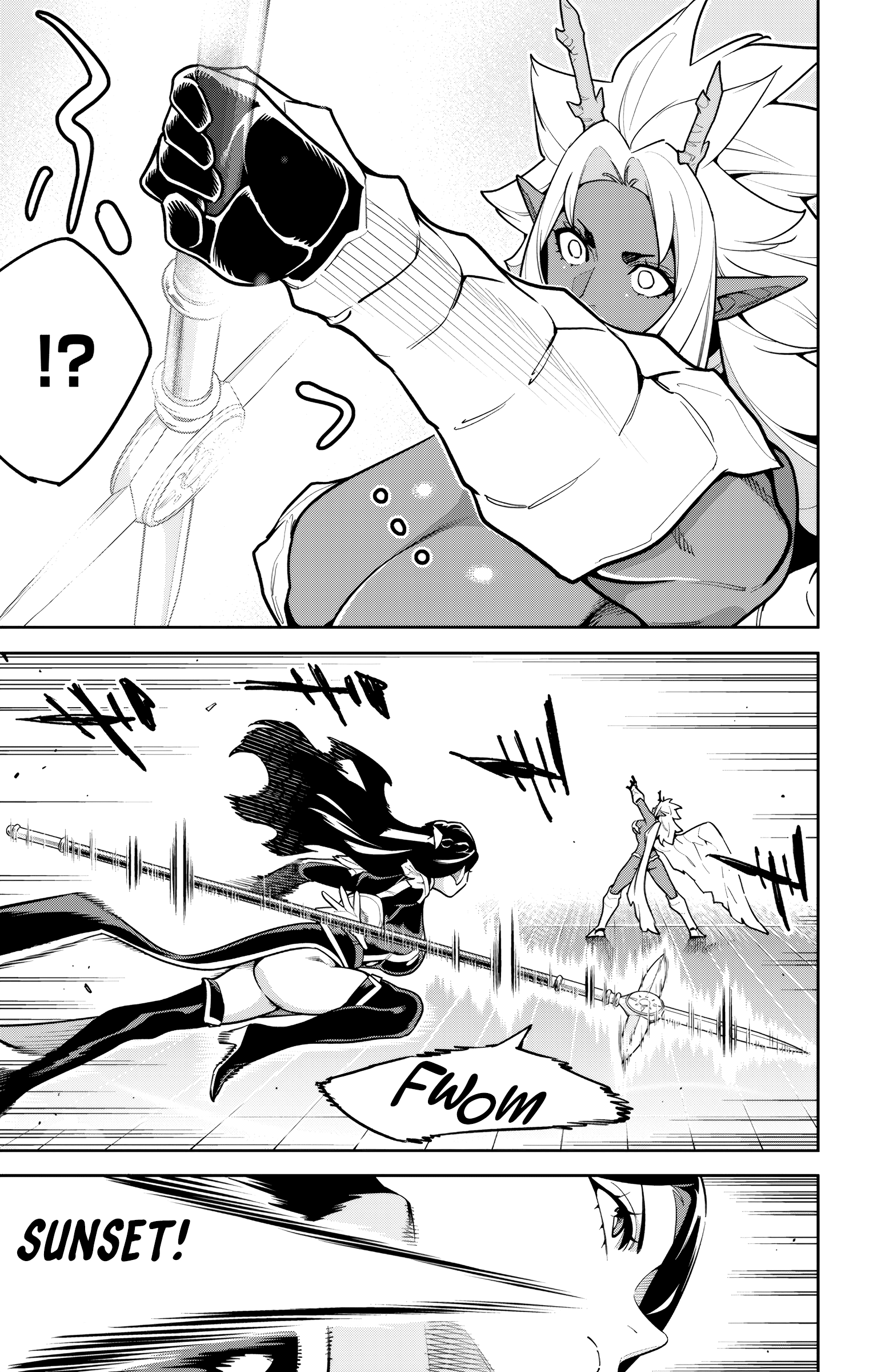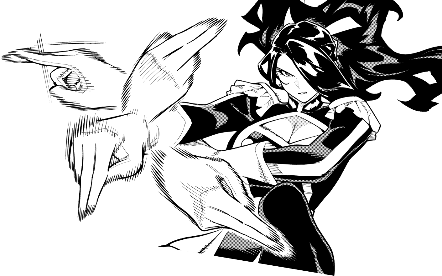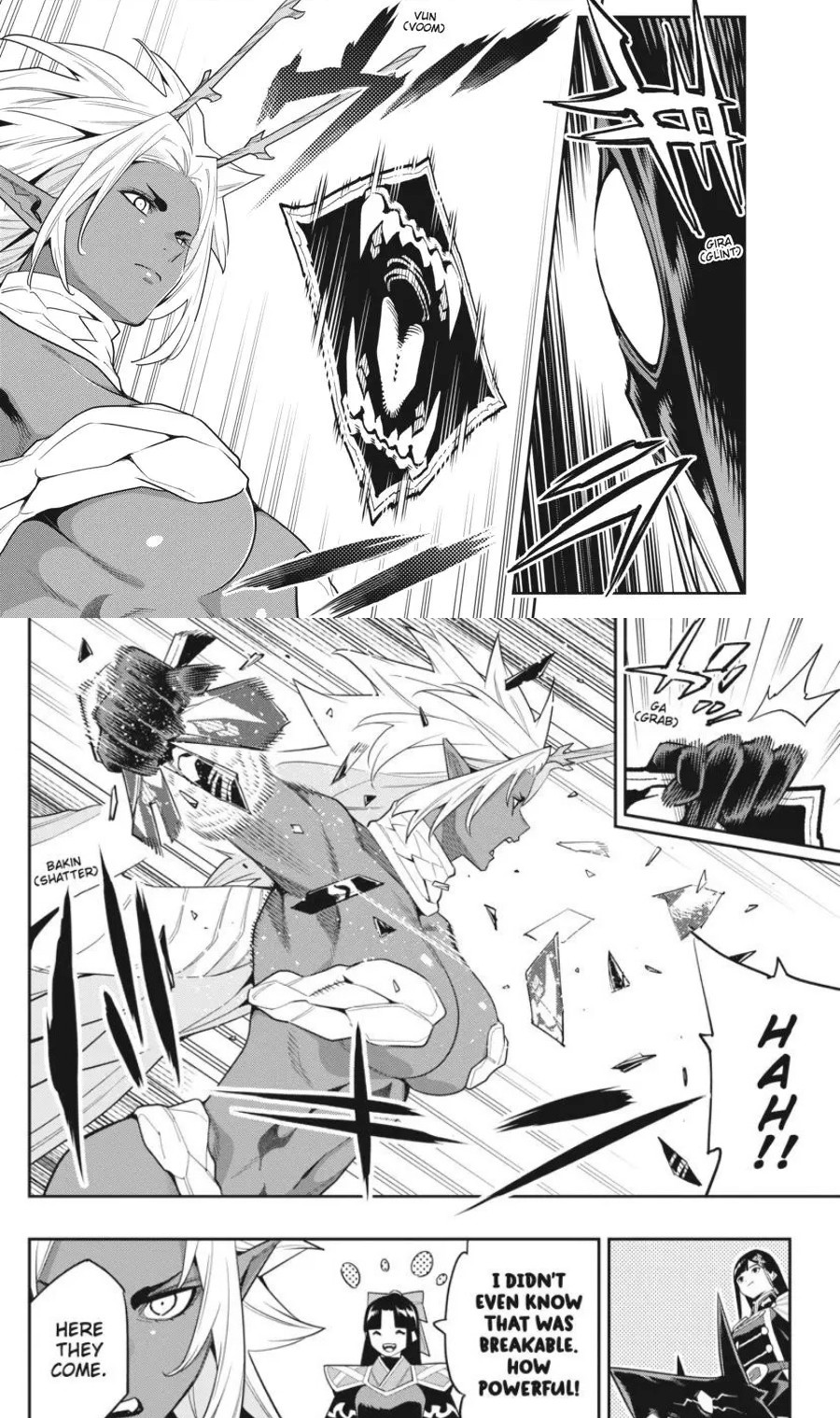 End of chapter.Damn, Jouryuu's a fucking beast handling three Chiefs at once and still getting the upperhand.Each Chief is severely injured and unless they have something else up their sleeves, I think they will lose this one.Jouryuu's physical might is just overwhelming.Although it might also be that she already knows the capabilities of the Chiefs beforehand that's why she's able to one-up them.The first two pages feel weird and misplaced but I keep on thinking that they might be death flags.Also remember that Fubuki wished for this matchup, she better have something ready and not just spear thrusts or else...