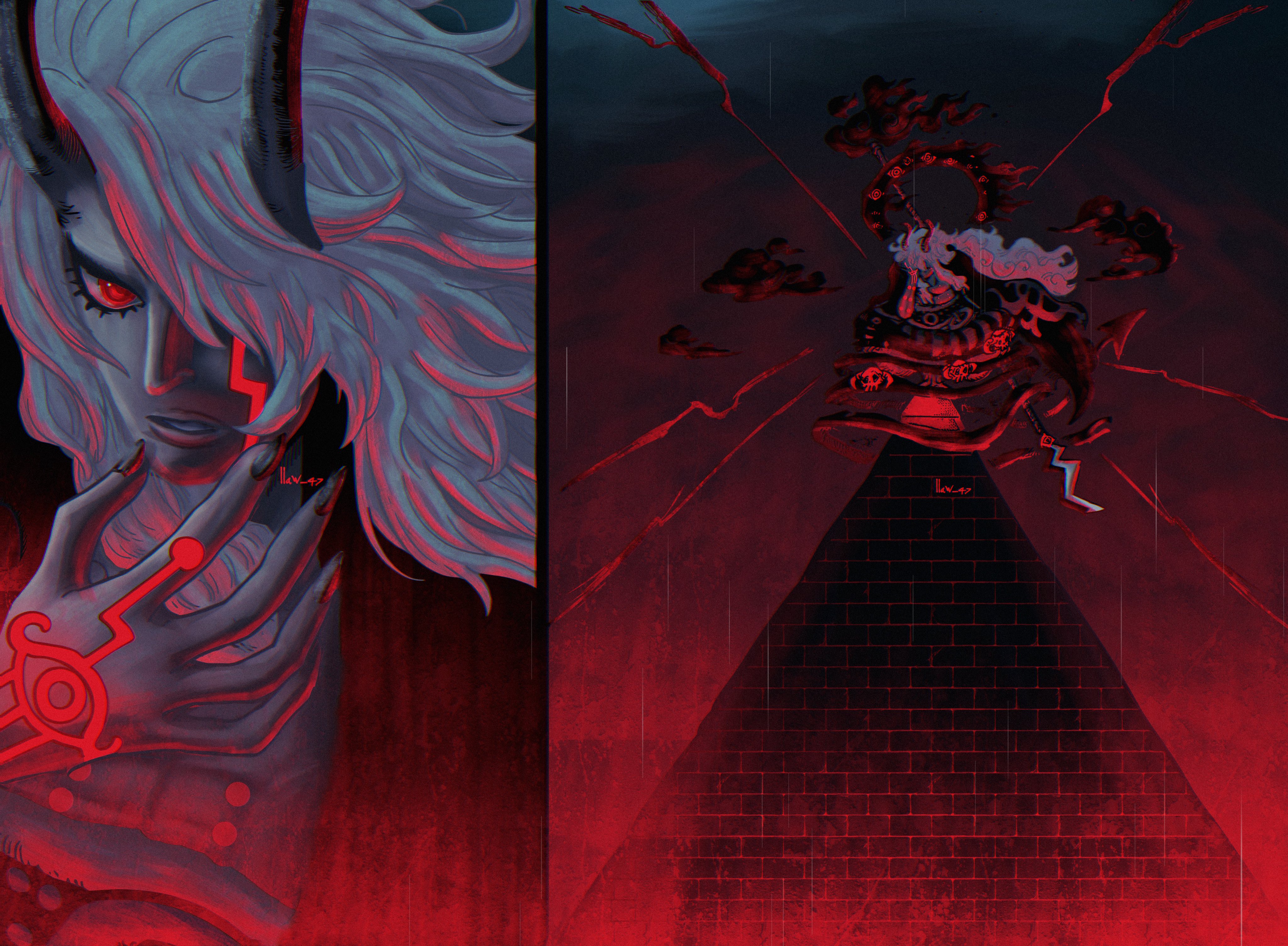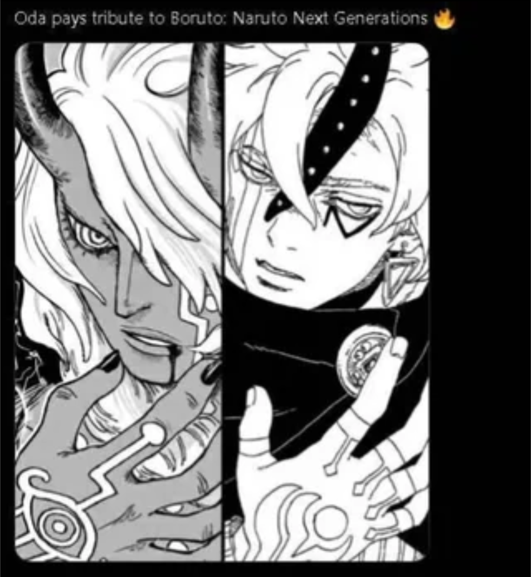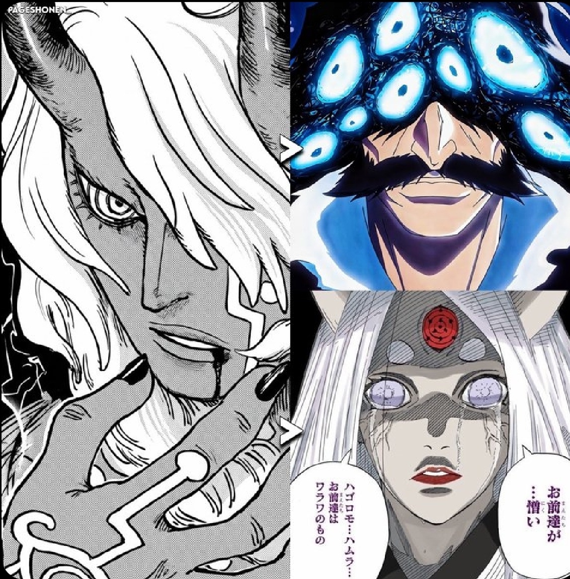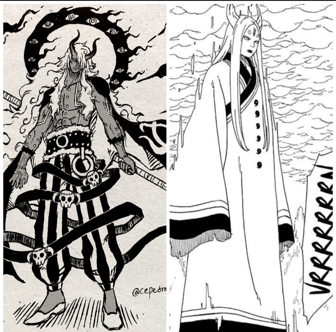 >>287216120Aside from possibly white hair what do they have in common? Kaguya has white eyes with a red Sharingan in her forehead, Imu had red ringed eyes like Mihawk which predates the Sharingan and Rinnegan. Kaguya is pale and Imu is dark. Kaguya is female and Imu is male. Kaguya wears robes and Imu is shirtless. Kaguya used her hands and Imu uses an Egyptian Kerris spear. Kaguya has weird straight horns like an animal and Imu has devil horns more similar to the Ancient Giants which also predates Kaguya. Imu has an awakening scarf like the one Enel had but with his eyes in it, Kaguya doesn't. Imu has tattoos, Kaguya doesn't. There's nothing Kaguya did before One Piece.