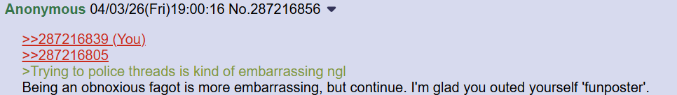 >>287218215>Not if you want [thing no one cares about]So go mature or go home it is.