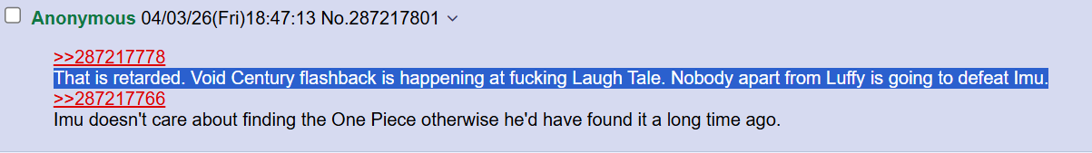 >>287215957If Imu doesn't defeat both Loki and Luffy easily, he'll be hands down the worst antagonist in One Piece. I'm actually lowkey hoping it happens just for the shitposting.