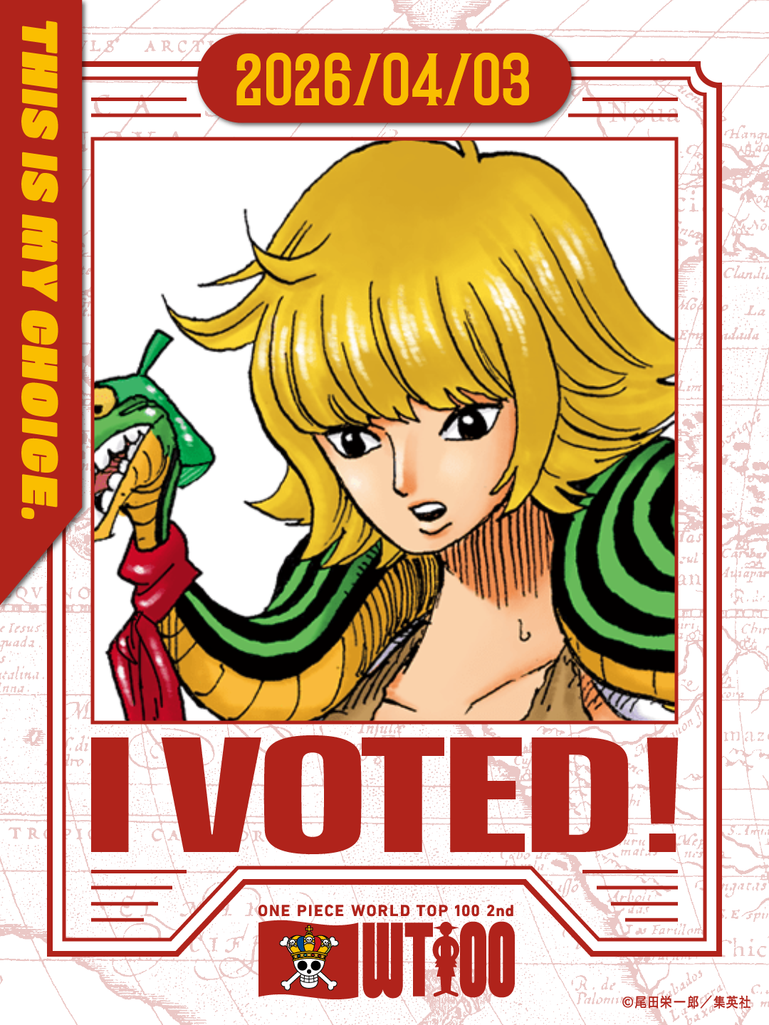 Voting for my favourite blonde side female who was underutilized by Oda despite her fun combat kit and creative talents, and who is now doomed to languish on an island we'll never visit again.