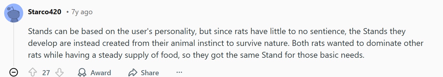 >>287226866>Why does the two rats have the same stand? >araki: i dunno, is it really that important?>fanbase: UHMM ITS BECAUSE YOUR STAND IS BASED ON YOUR SOUL OR SOME SHIT AND LIKE THE RATS HAVE COMMON DNA AND THEYRE RELATED LIKE HOW JOSEPH AND HOLLY SORTA HAVE THE SAME STAND AND LIKE THE RATS COULD BE BROTHERS AND THE RATS PROBABLY HAVE LOW INTELLIGENCE SO ALL RATS WOULD PROBABLY HAVE THE SAME STAND OR SOMETHING