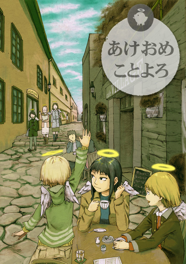 There's a doujin that has all of ABe's characters reincarnating as Haibane. The twins at the end of the show turn out to be NieA and Mayuko if I remember correctly. Lain ends up showing up too, as well as Ran. Poor Rakka dealing with NieA was pretty fun