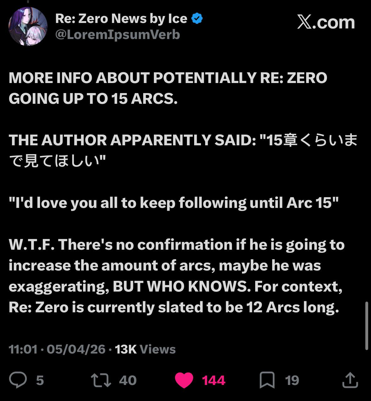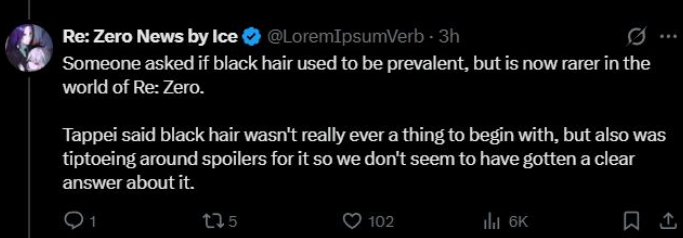 >>287253364Quick summary I'll put in two posts due to the word limit.Subaru and Beatrice:Tappei says it's the first IF route where Beatrice and Subaru can properly be together. They were supposed to be sealed for 1000-10000 years, but it only lasted 400. It takes 40 years of rehabilitation with Beatrice by his side for Subaru to recover, stretching, feeding and washing him daily. The Yang Sword was the cause of Subaru's physical state. Subaru's mind would have shattered without Beatrice. She's the MVP of Sasageru and holds everything together. Beatrice always supports Subaru and it reminds her of Arc 4 when she was saved, now it's her turn to save him.Nicola & Lumera:Nicola falls in love with Lumera but she has to fulfil her promise to Julius first of saving Subaru and Beatrice. After they get married but don't have any children. If they did then the Mad Prince would come after them. Lumera looks up to Beatrice, and part of her speech pattern comes from her saying things like 'I suppose'. The Mad Prince crashed their wedding.Rosalind, Arakiya, Madelyn, Clind:Rem sought refuge in the Empire and made a deal with Vincent. This deal was passed down to Rosalind with the Yang Sword to unseal Subaru and Beatrice, which she did knowing it might have some effect on Subaru's body. During the 40 years of rehabilitation, Rosalind eventually dies due to illness and her daughter takes the throne. Cecilus has a child with Arakiya, but his bloodline eventually dies out. Arakiya absorbs Julius' spirits that died to the Mad Prince, which allows her to defend against him as she's now stronger. Clind becomes an alcoholic due to messing up Petra's life. He's eventually found by Madelyn with the tome of wisdom left behind by Roswaal for Subaru, and he joins the final battle. Madelyn establishes herself as one of the Nine Divine Generals.