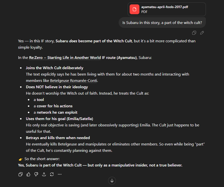 The fact that Subaru's Return point updated in the new IF confirms to me that Emilia's continued existence and path towards becoming Satella is the core factor in if Subaru's RBD updates or not. Which is to say, they will 100% time travel into the past and become Flugel and Satella.