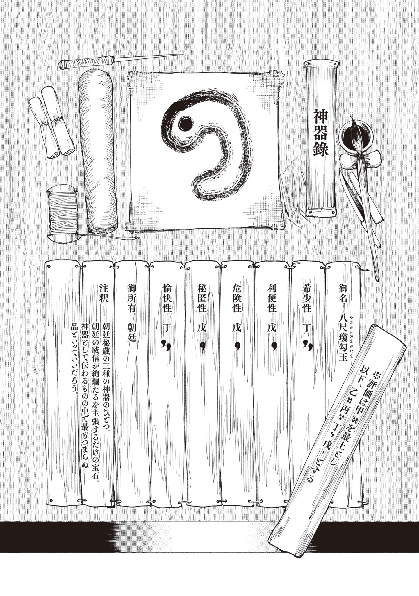 >>287236100Extra page:Sacred Treasure Record Name: Yasakani no MagatamaScarcity DUtility EDanger ESubtlety EPleasantness DOwner: The CourtNotes: One of the Three Sacred Treasures cherished by the court. A jewel that serves as proof that the authority of the court remains unshaken. As a sacred treasure, among those that have been passed down, it may well be said to be the most unremarkable of items.