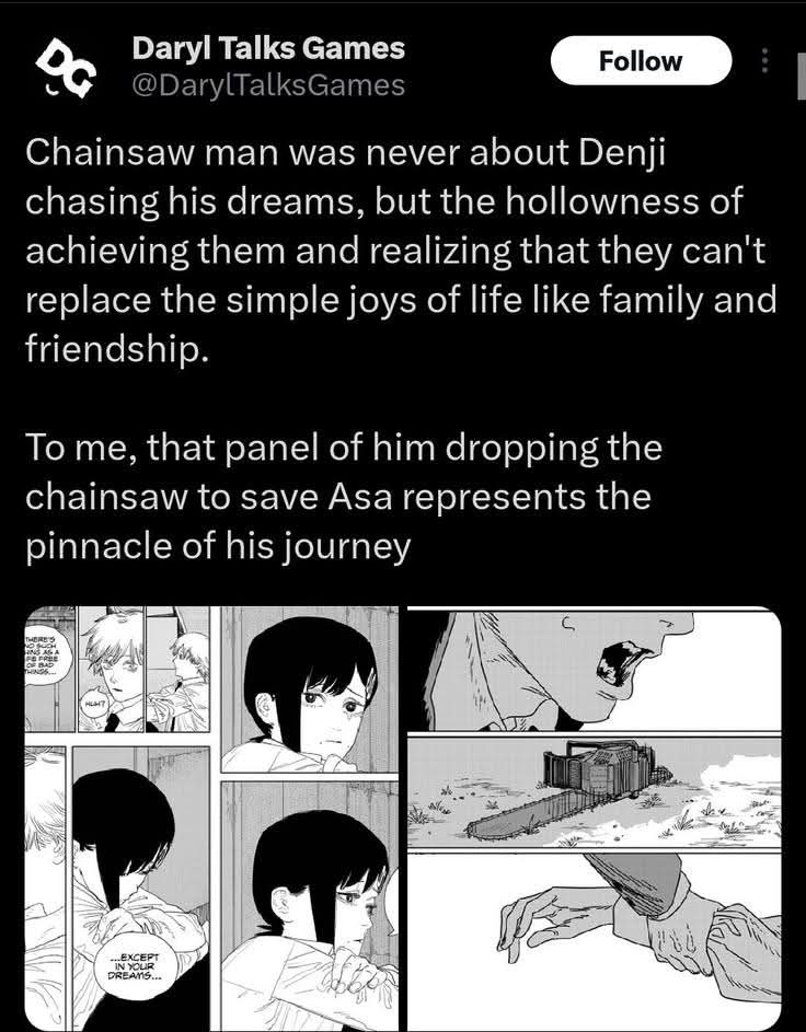 >>287250880denji had no realisation though.it was all pochita making the decision to reset everything.denji's entire story was pointless since he's back where he started."it was just a dream bro" tier shit.