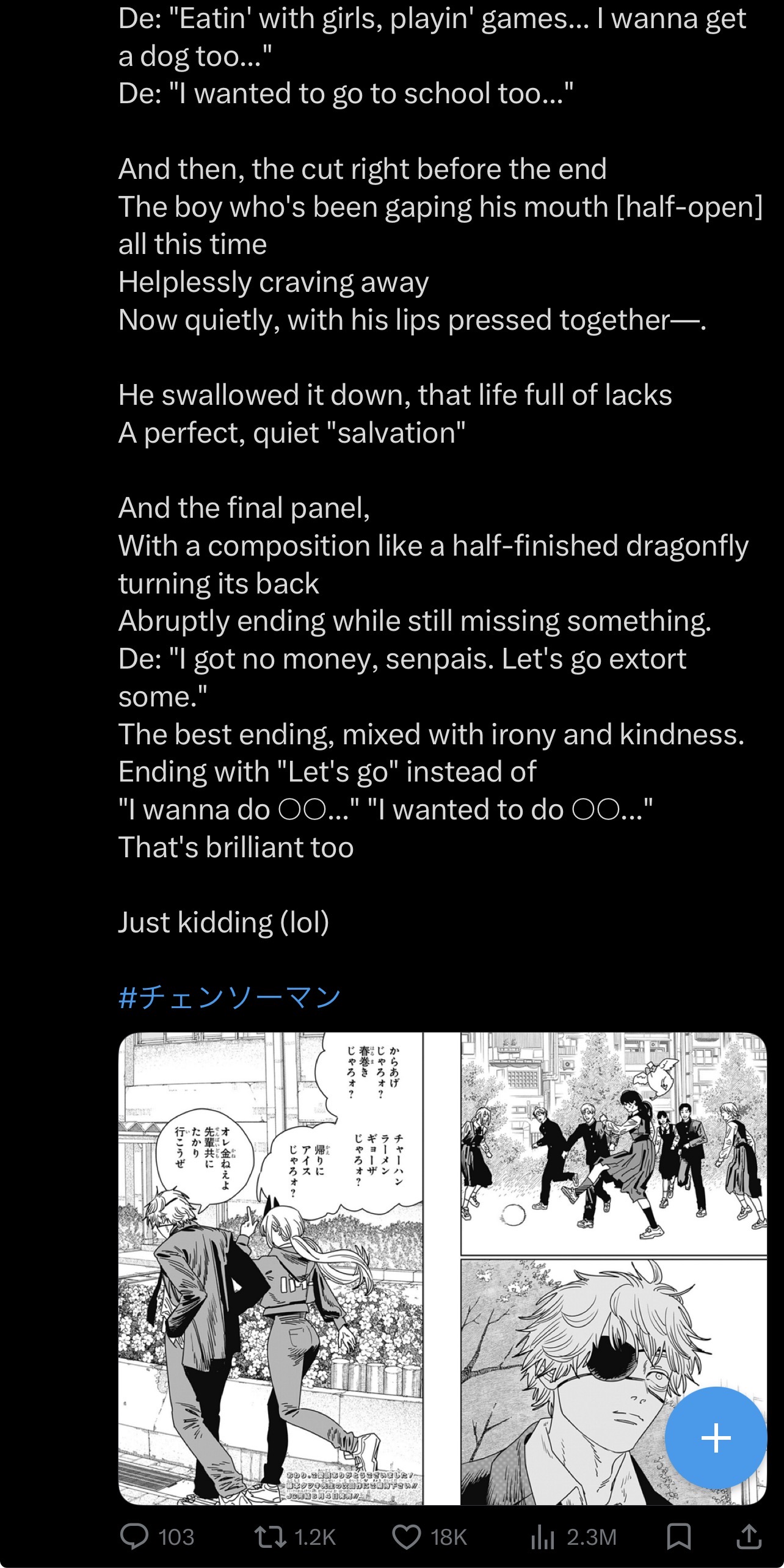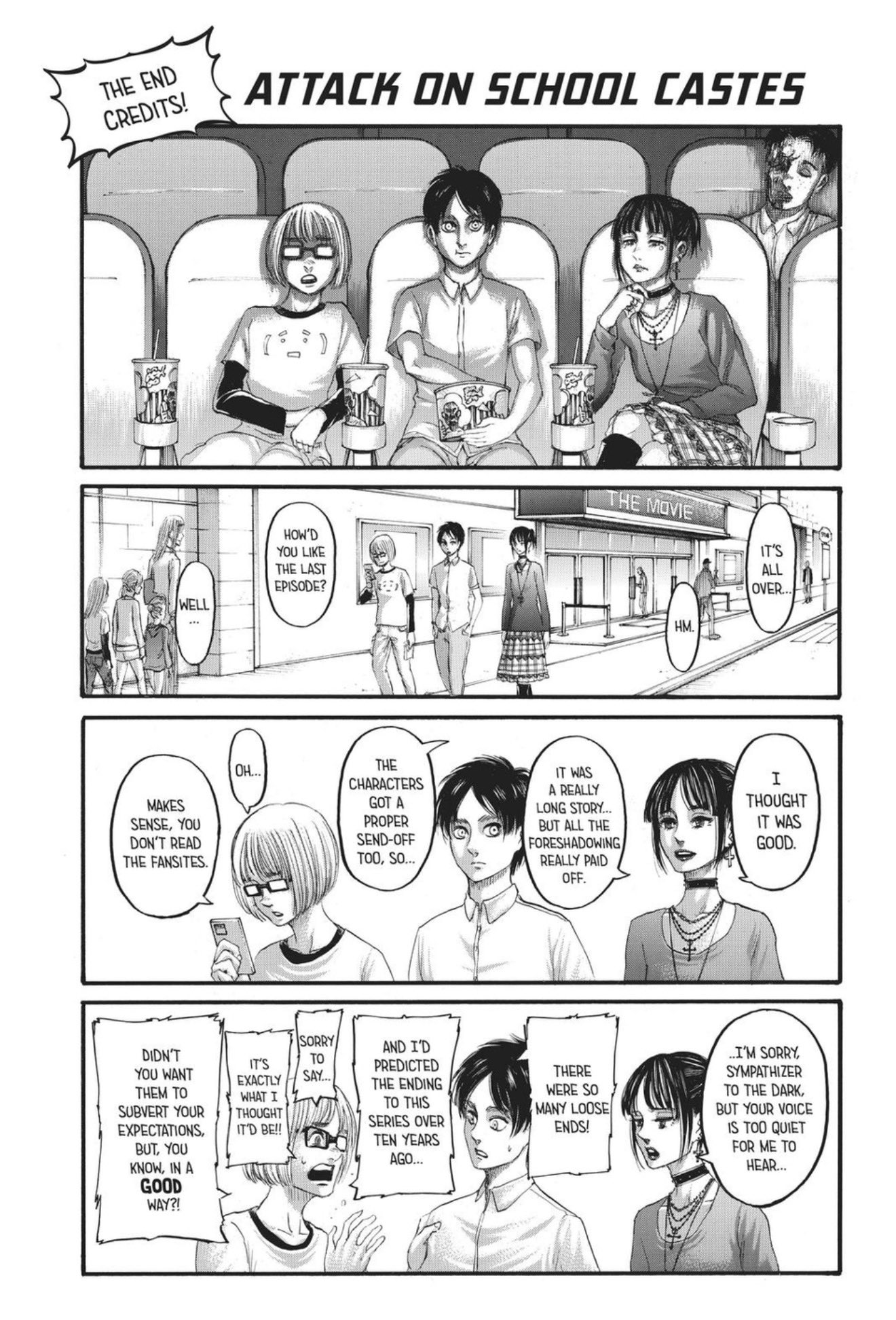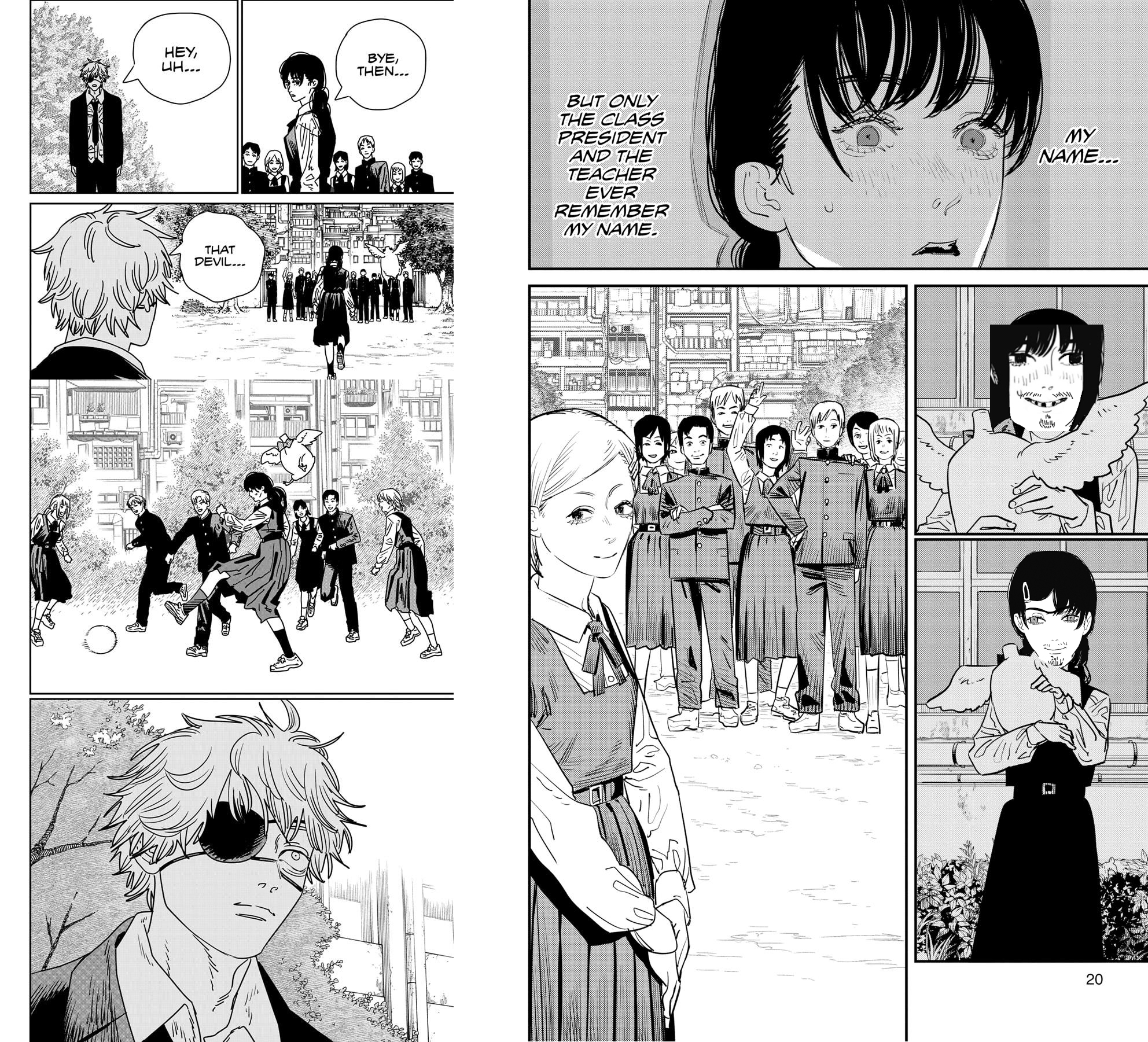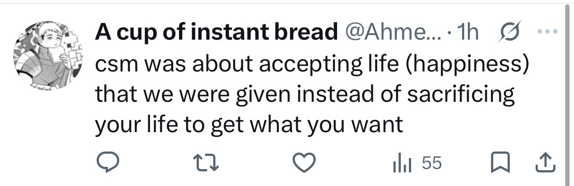 Very strange how many people are still out there defending the ending, saying things like "this is the best we could have hoped for for Denji, so I'm happy with it." With AoT I kind of saw where the people who liked it were coming from because, for all its flaws, it was a fully formed conclusion that tied up every loose end. CSM's ending is just so clearly the author throwing his hands in the air and abandoning his work. The story doesn't even really end. It just stops.