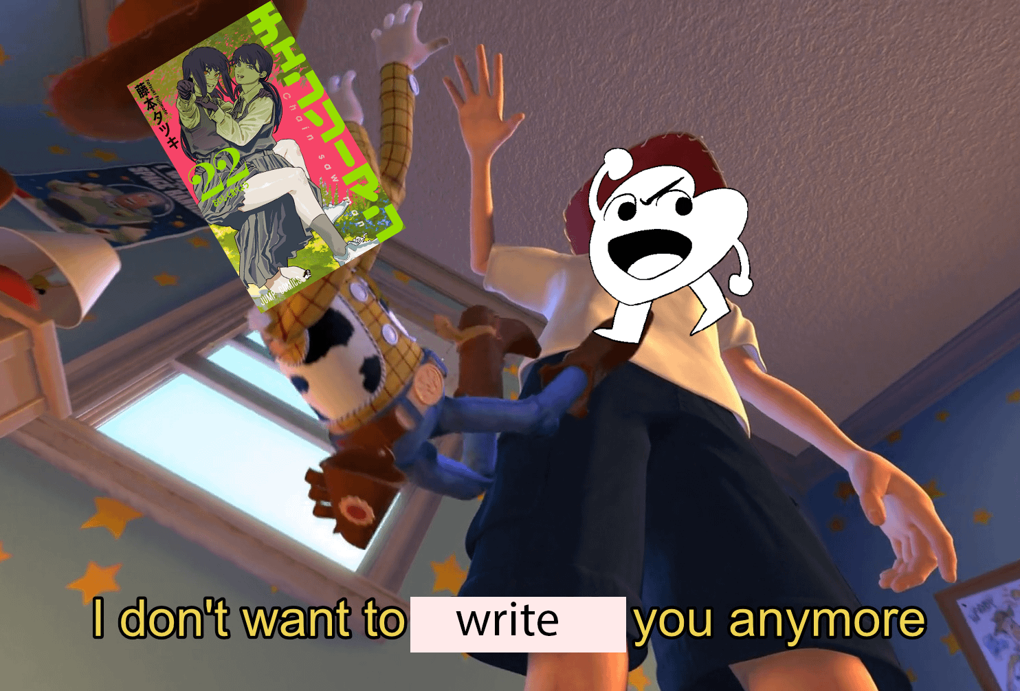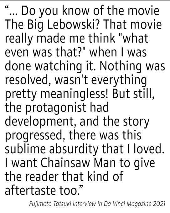 part 2 is all meta it's basically just fuji expressing his feelings about the reception to part 1 and how his life has changed. asa, yoru, famine and death all represent different feelings that fuji has about chainsawman the manga. a huge chunk of the manga just has shit that makes no sense and it constantly breaks the rules and foreshadows stuff that goes nowhere because it's taking the piss out of part 1. the most blatant part is when the fire punch devil shows up, lights a giant building on fire which is a reference to one of the most iconic scenes in fire punch, possesses a guy that looks exactly like agni and starts turning everyone into chainsaw man clones which causes a right wing uprising. all of this is just meta commentary on the reaction to chainsawman, like the president of argentina using pochita as his mascot and citing his dead dog. the opening bit where denji goes to school is a direct reference to the End of Evangelion bit where it becomes a slice of life. it's symbolic of your art becoming commercial