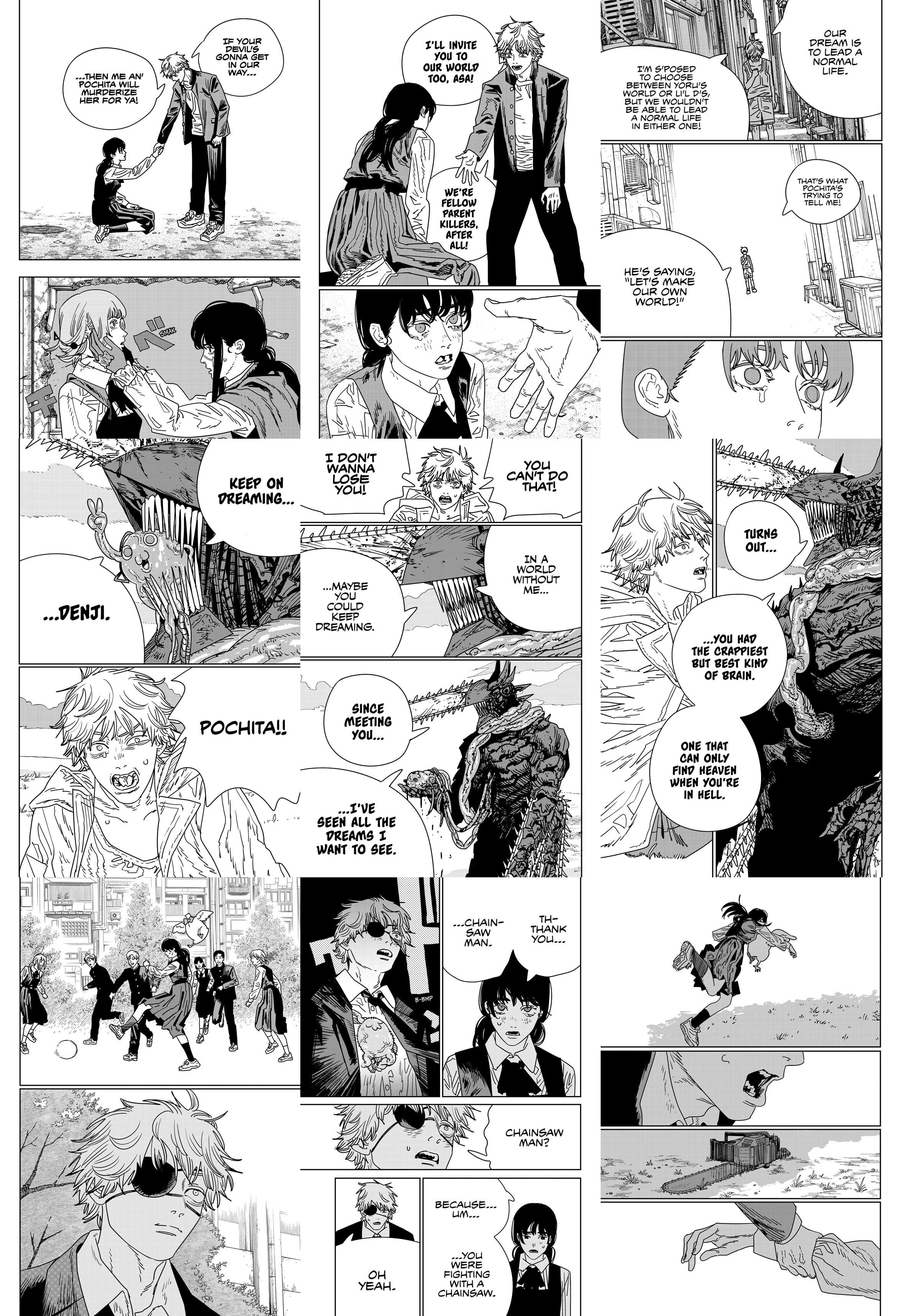 >>287258267>Why the fuck is this schizophrenic shit?It's called "discussion", my braindead friend. Try it sometime.>>287258277If that were the case Fujimoto wouldn't have written it that way. He clearly wanted to be done with Chainsaw Man, but there was deliberation as to what he wrote and drew for the ending.