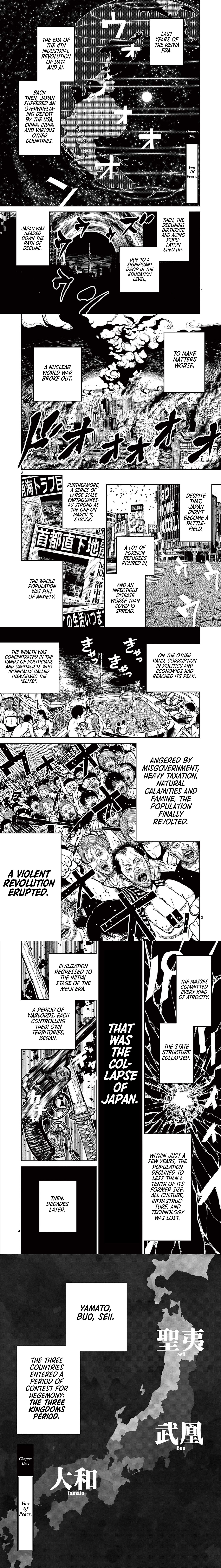 >A revolution sparked by nuclear war, natural disaster, and misrule leads to the collapse of Japanese society. The country splits into three nations vying for hegemony, and the Sangoku era begins. Aoteru Misumi, a former agricultural officer, vows to reunify Japan. He rises through the ranks with only his knowledge and eloquence. Witness the legend of the man later hailed as a genius strategist.Political anime of the season in 1 hour.