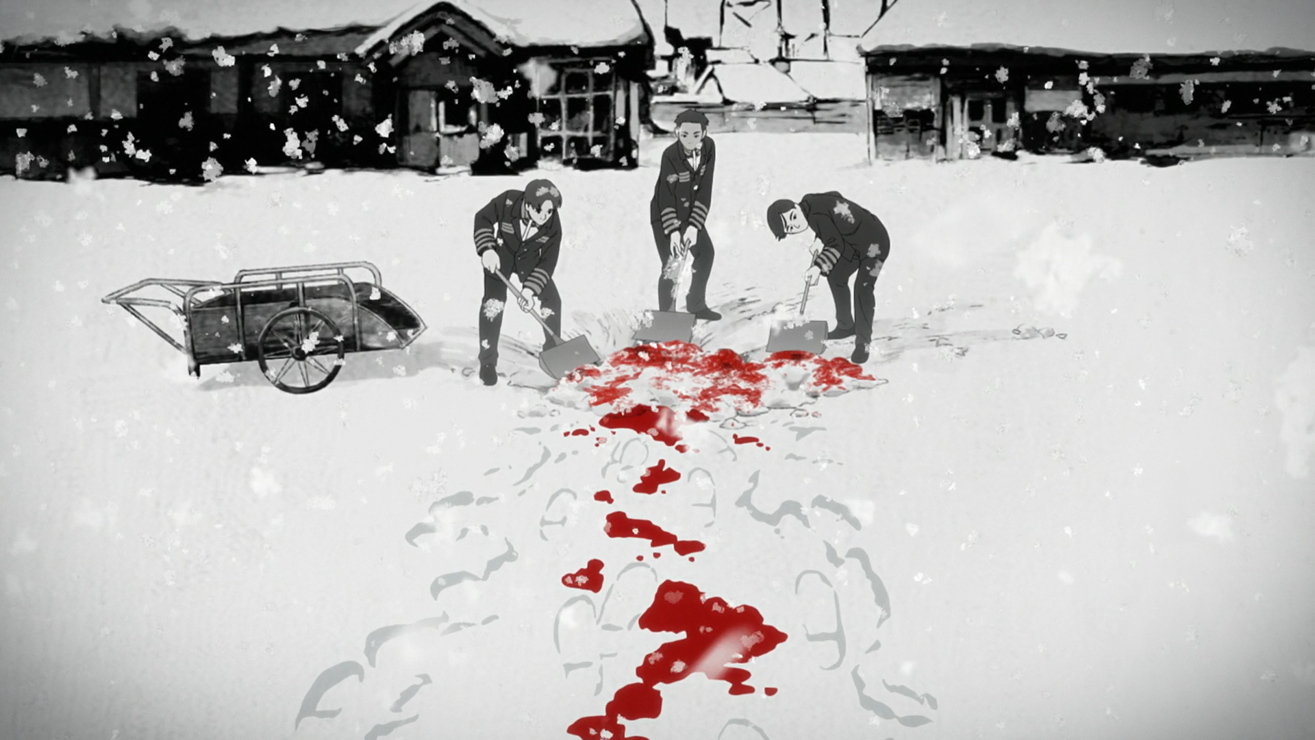 >>287263245>>287265235Just some blood on the snow, a description of what they did and her head. Then the way he placed her head and laid out her wedding dress. That was rough without witnessing the actual act, they did a good job with this part especially.