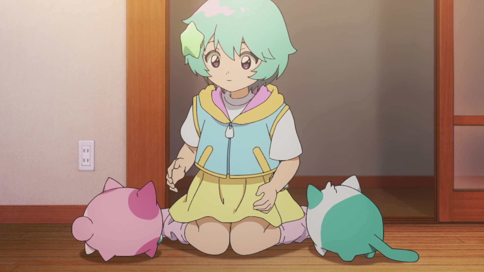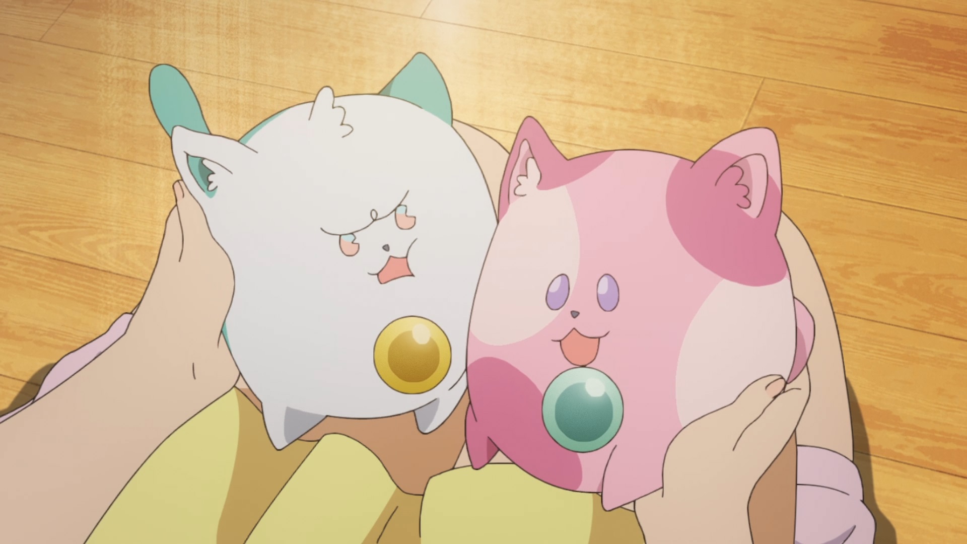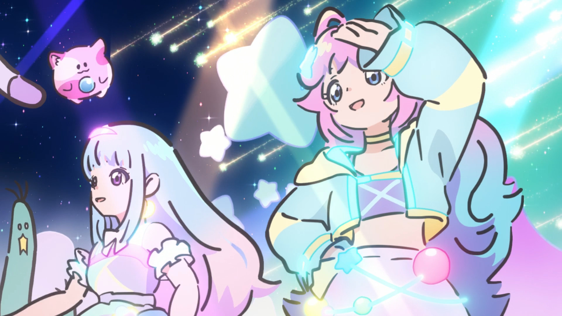 >Suddenly, they are given magical powers by two cat-like spirits, Uguisu and Azuki, allowing them to transform into magical girl idols.