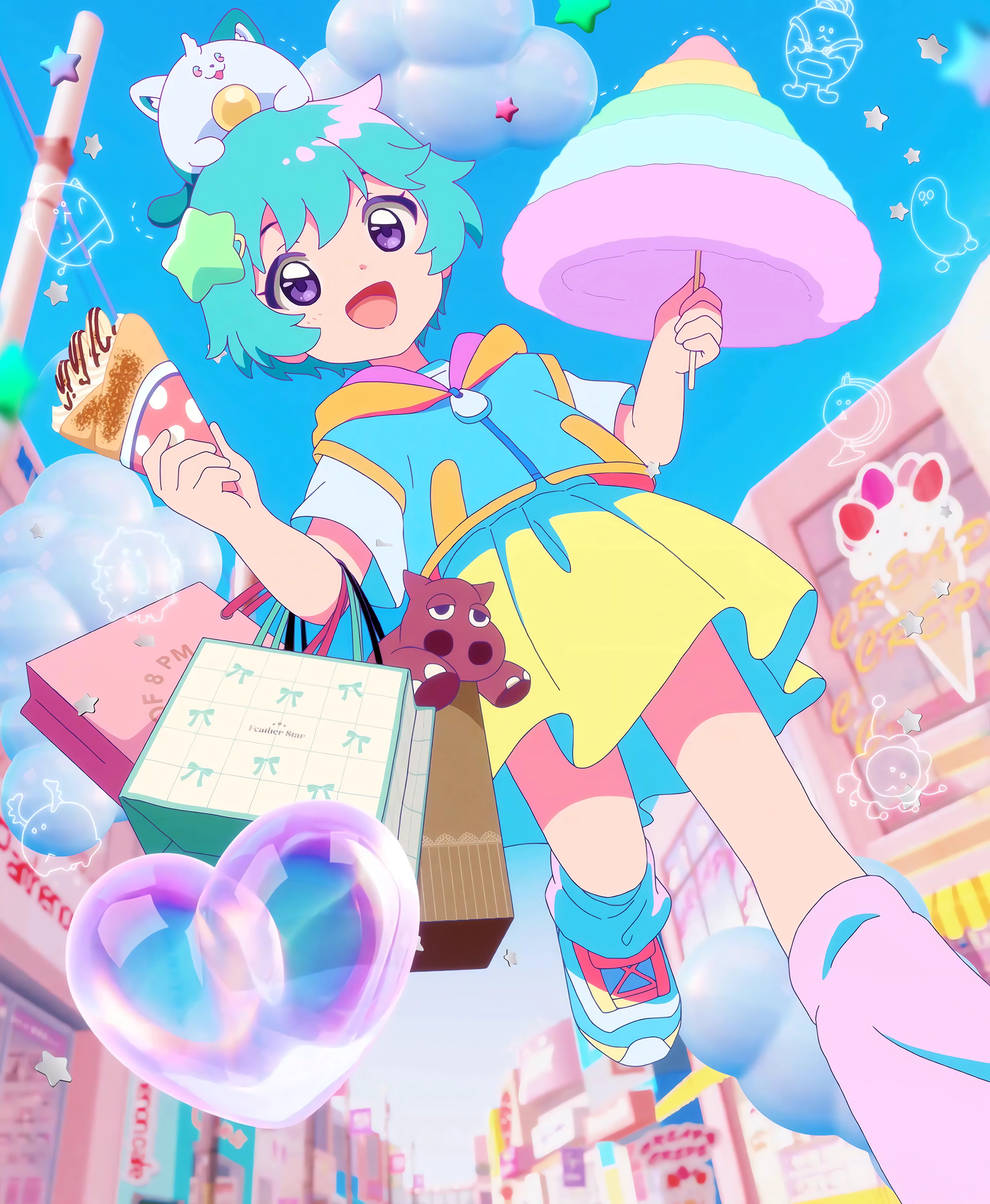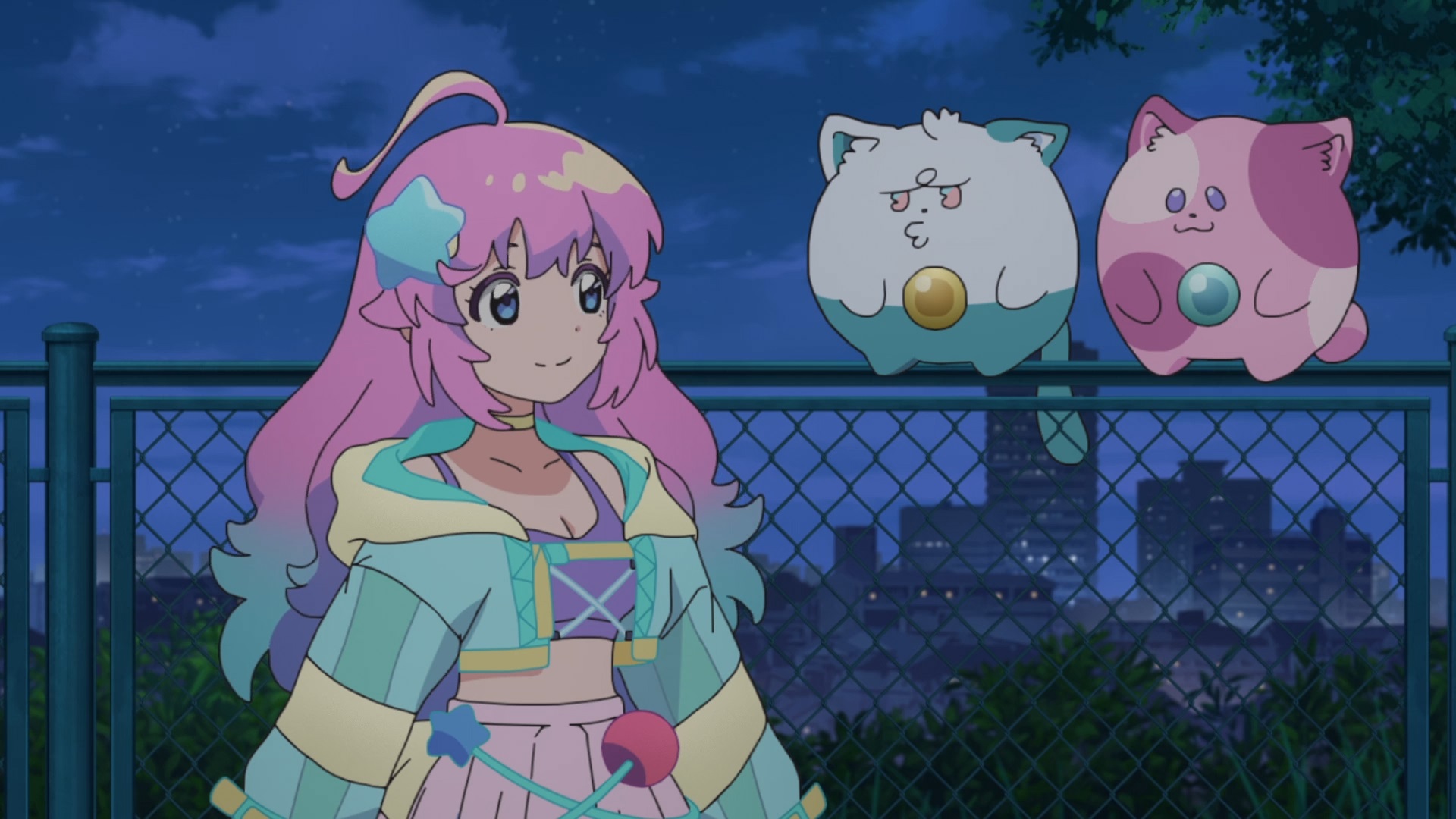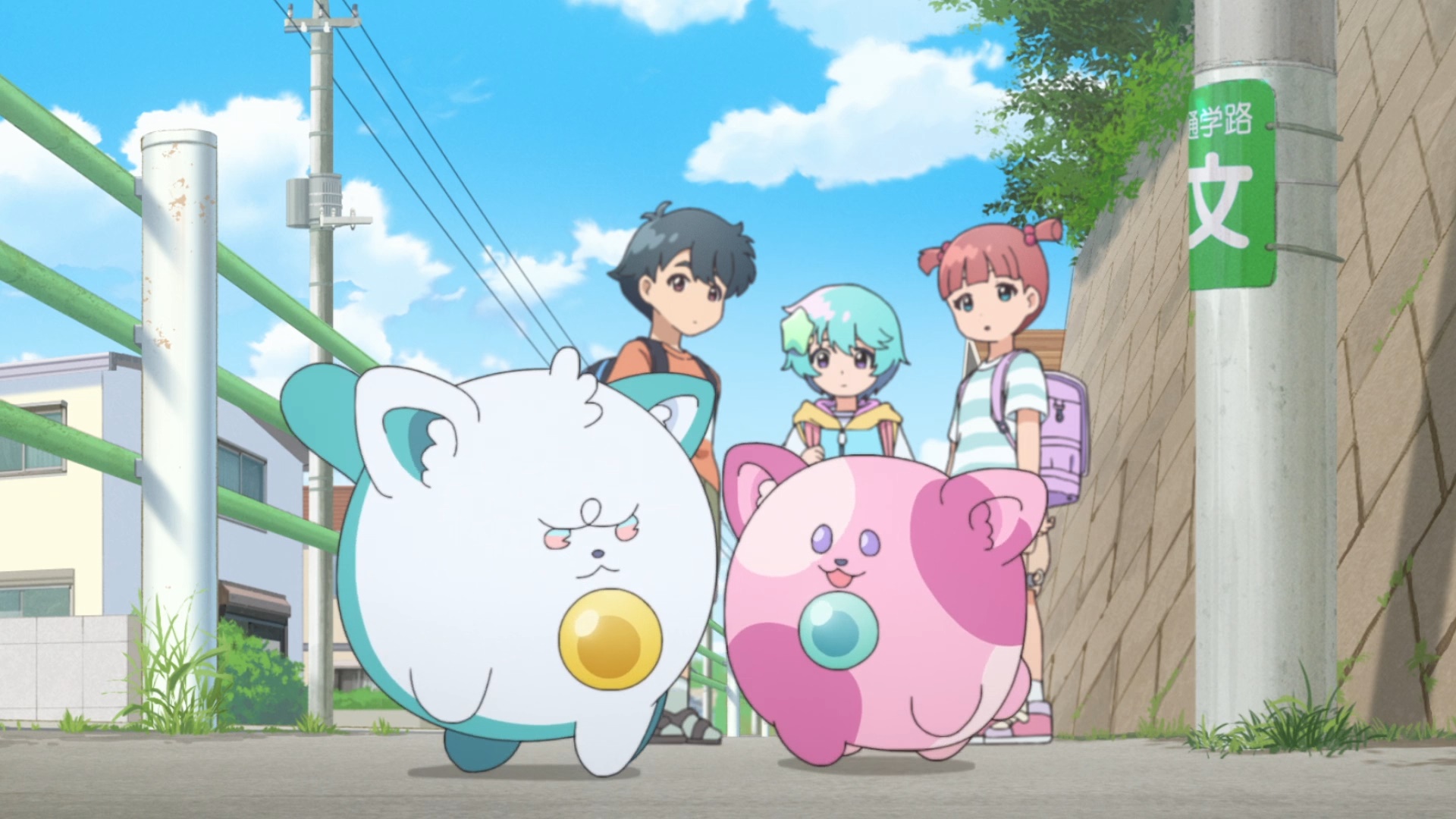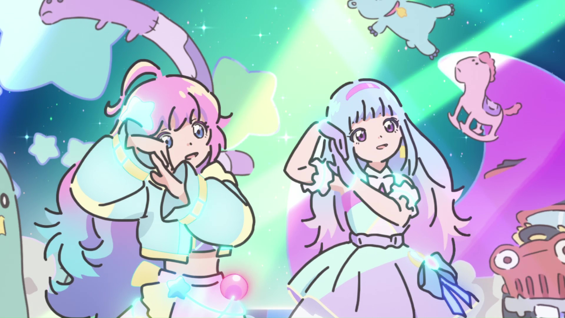 >Suddenly, they are given magical powers by two cat-like spirits, Uguisu and Azuki, allowing them to transform into magical girl idols.