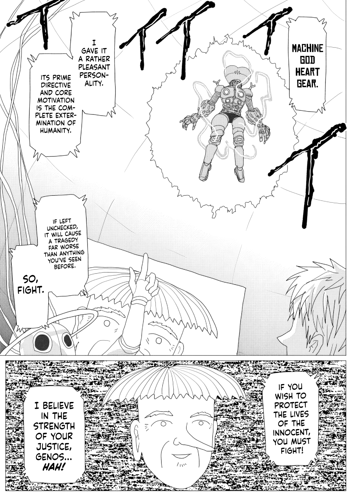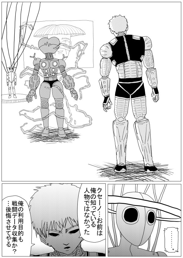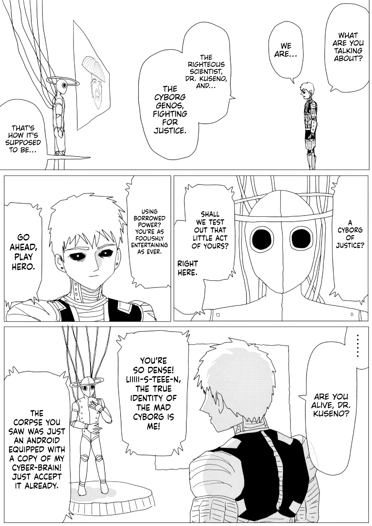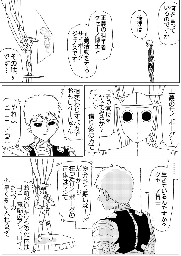 So basically.>Saitama is now A class Rank 1.>Genos's whole story is confirmed to be a lie.>This whole arc was just Dr. Kuseno gathering battle data and now he wants to test his latest cyborg prototype on Genos.