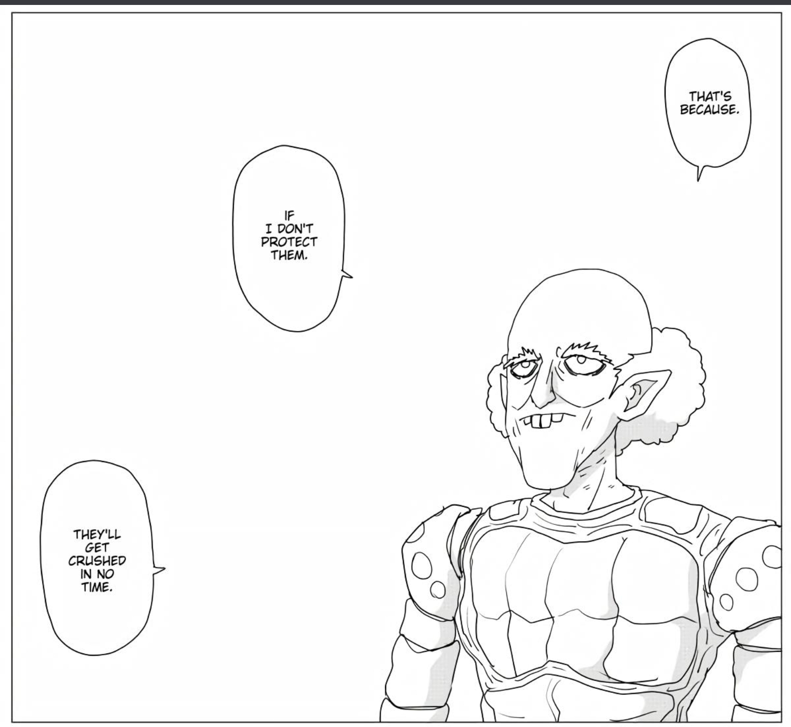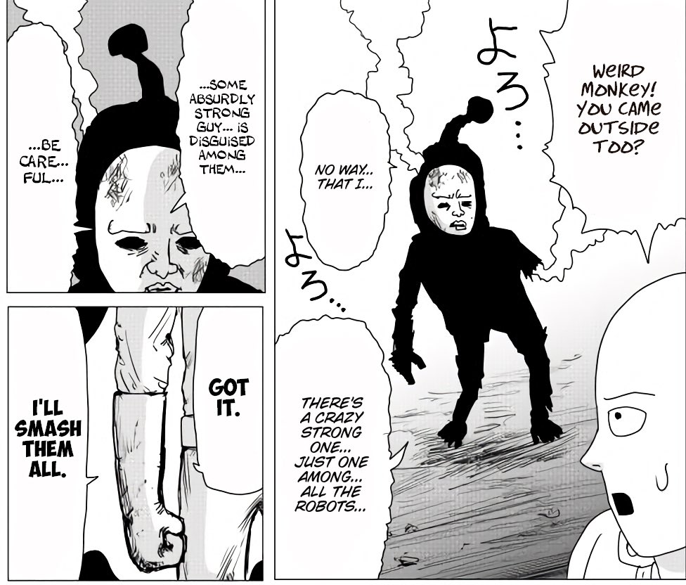Feels like there's going to have to be some other purpose like maybe Genos is a robot to kill god or something, if ONE has any intention of using God. I'm just not getting any interal logic from become murder bot, get BTFO'd, decide to make murder bot army and then have weird pet hero and continue to goad him on to the point of mental breakdown.