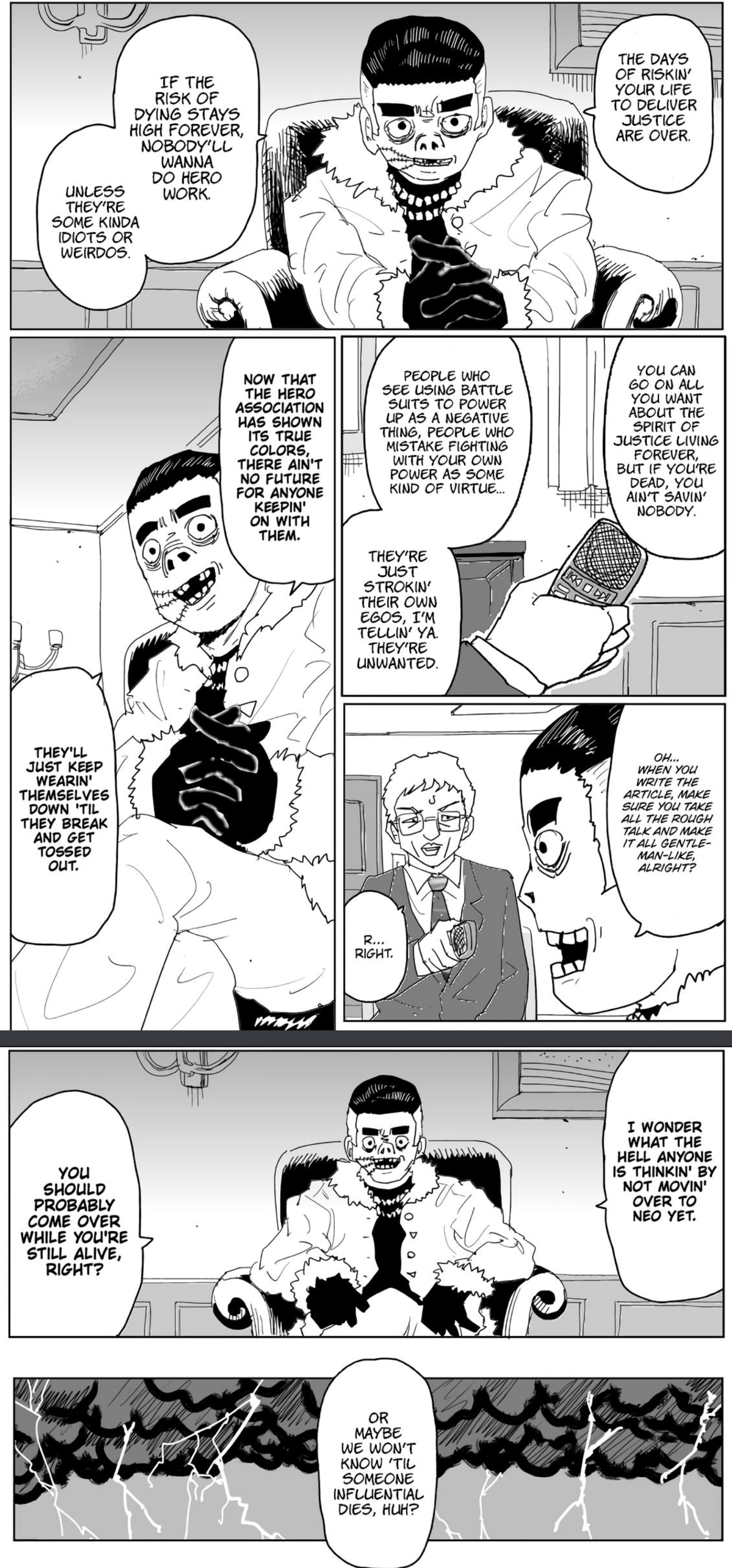 Anyone else think that Saitama is actually going to leave the Hero's Association permanently? I bet he'll join Sweet Mask's network of outcasts due to politicking keeping him from returning