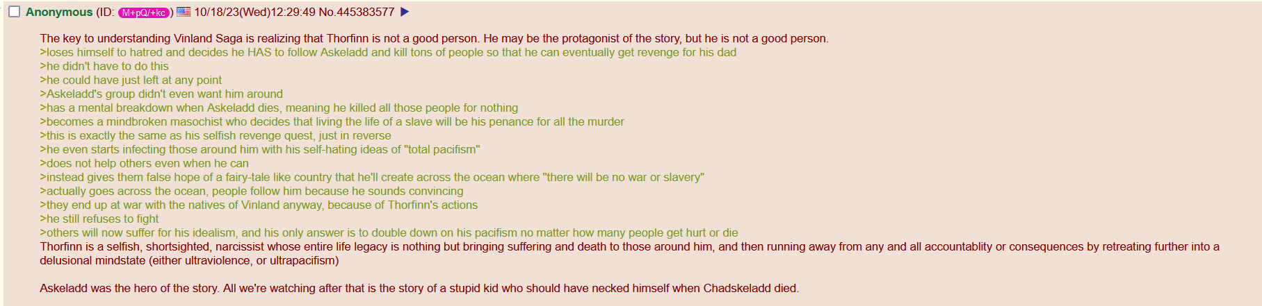 >>287284657Using google lens on this greentext has the AI generate an counter-answer to this post. It's interesting to say the least.Part 1/2The image contains a 4chan post presenting a highly critical "hot take" on Thorfinn, the protagonist of Vinland Saga. The anonymous user argues that Thorfinn is a selfish, narcissistic character whose shift from "ultraviolence" to "ultrapacifism" is just another way of avoiding accountability.Here is a breakdown of the argument presented in the post and a look at the broader context of the series.Summary of the Post's ArgumentThe poster makes several aggressive claims to support the idea that Thorfinn is the "villain" or a "bad person":Pointless Violence: He chose to stay with Askeladd’s band and kill innocent people for a revenge quest he could have abandoned at any time.Selfish Penance: His shift to pacifism is framed as a "mindbroken masochist" phase where he forces his self-hatred onto others.Dangerous Idealism: By preaching "total pacifism" and a "fairy-tale country" (Vinland), he leads people into danger but refuses to fight to protect them when things go wrong.Escapism: The poster views both his warrior phase and his pacifist phase as ways to run away from the consequences of his actions.The "True Hero": The post concludes by claiming Askeladd was the actual hero of the story.