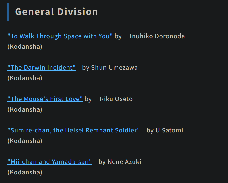 >Ichi the Witch by Osamu Nishi and Shiro Usazaki has been nominated to the 50th Kodansha Manga Awards.>the other nominees in the same category 'Youth Division' include: “Utsura Naindesu” — Maruka Konoshima; “The Fragrant Flower Blooms with Dignity” — Saka Mikami, and “Gachiakuta” — Kei Urana