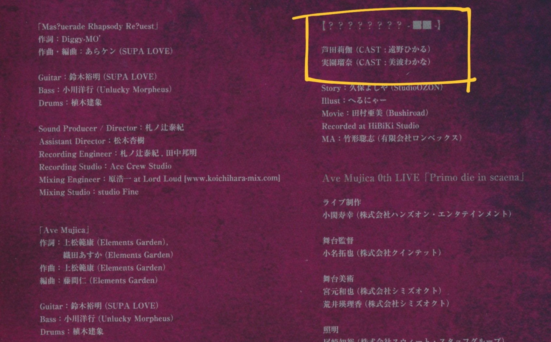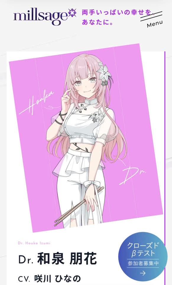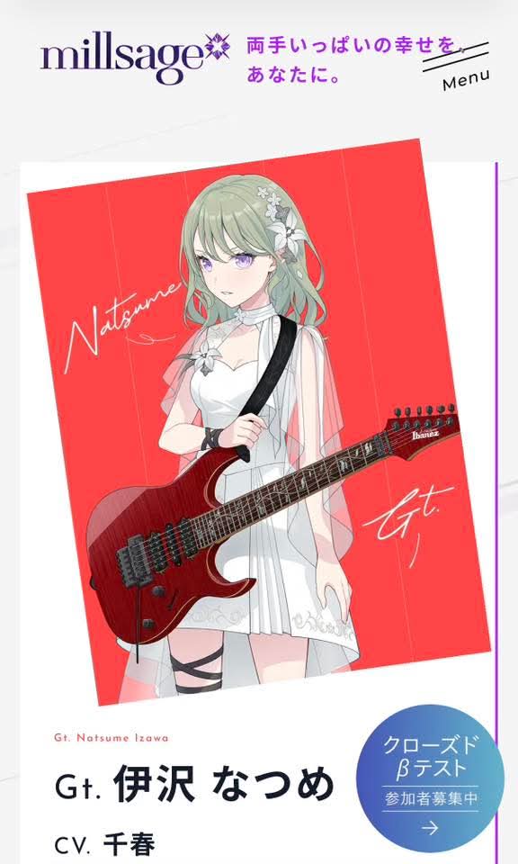 Ikka Dumb Rock!>Yomogi: Hanamiya Niina (Kozue in Hasunosora and also Atori in Bad Girl)>Chieri: Hisakawa Hana (Yui/Cure Precious in Delicious Party PreCure \)>Shizuku: Toono Hikaru (Matikanetannhauser/Mambo in Uma Musume, Yujia Wang in Assault Lily, Anna in Makeine, Howan in Show by Rock and Shiori in Revue Starlight)millsage>Nagi: Yuikawa Asaki (Hojo Tokiyuki in The Elusive Samurai)>Mahoro: Igoma Yurie (Ruby in Oshi no Ko and Eimi in D4DJ)>Houka: Sakikawa Hinano (Azu in Maebashi Witches)>Natsume: Chiharu (ex-22/7 member and voiced Reika there! She's also Aimi (Kasumi)'s little sister)Live bands essentially deconfirmed