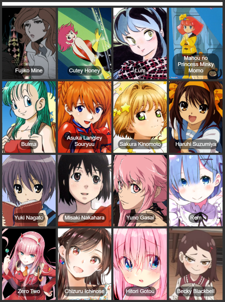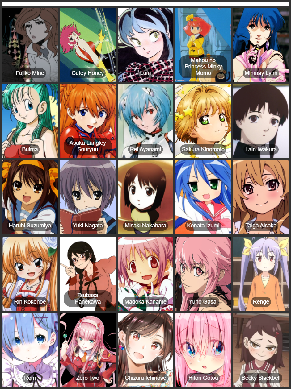 >>287291699I expanded it>>287293993>70sFujiko Mine (Lupin III)The first femme fatale. She debuted in 1971. Her modern design and personality influenced the other girls of the decade and the futureCutey HoneyFirst ecchi girl>80sLumThe first mass-market sex symbolMomoFirst famous loli magical girlMinmay LynnFirst idolBulmaThe first waifu from everyone's first anime>90sAsukaFirst and most famous tsundereReiFirst and most famous kuudereSakuraThe Queen of the lolisLain IwakuraThe internet girl who predicted the future>2000sHaruhiThe goddess who founded a religionYuki NagatoThe best kuudere Misaki NakaharaThe girl you've always been waiting for to make your life betterKonataThe otaku girlTaigaThe toxic girl you just can't seem to stop being drawn toRin KokonoeThe loli who broke the decadeTsubasa HanekawaMegane and megatits>2010sMadoka KanameThe girl who changed magical girls foreverYuno GasaiThe Original YandereRengeThe favorite of /a/RemThe love-struck girl and the archetype of rejected girlsZero TwoThe super-popular girl who's a little crazy. The borderline girl>2020sChizuruThe girl who monetizes her beauty, representing the generation of OnlyFans girlsBocchiThe girl who represents youBeckyThe loli who broke the age barrier for an entire new generation