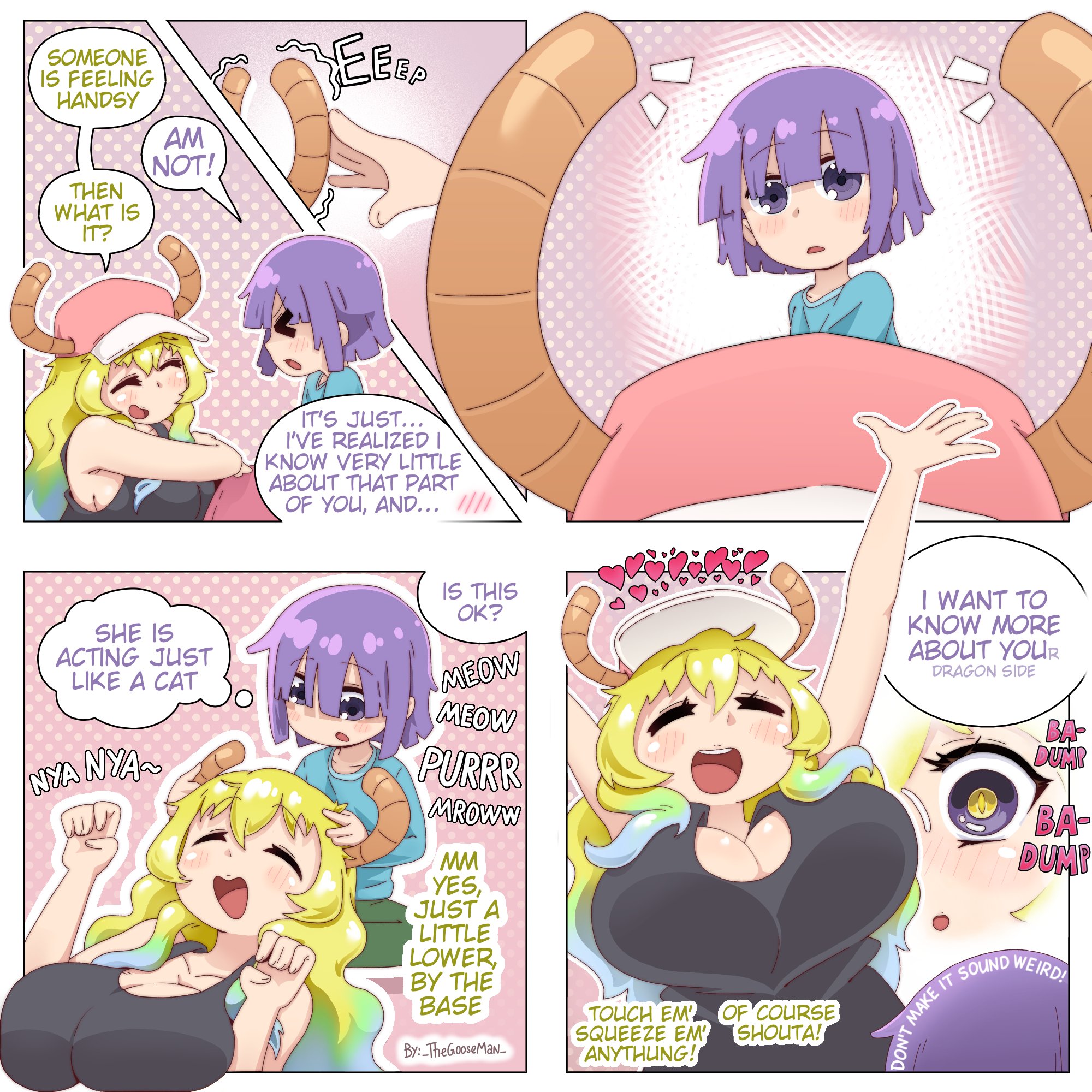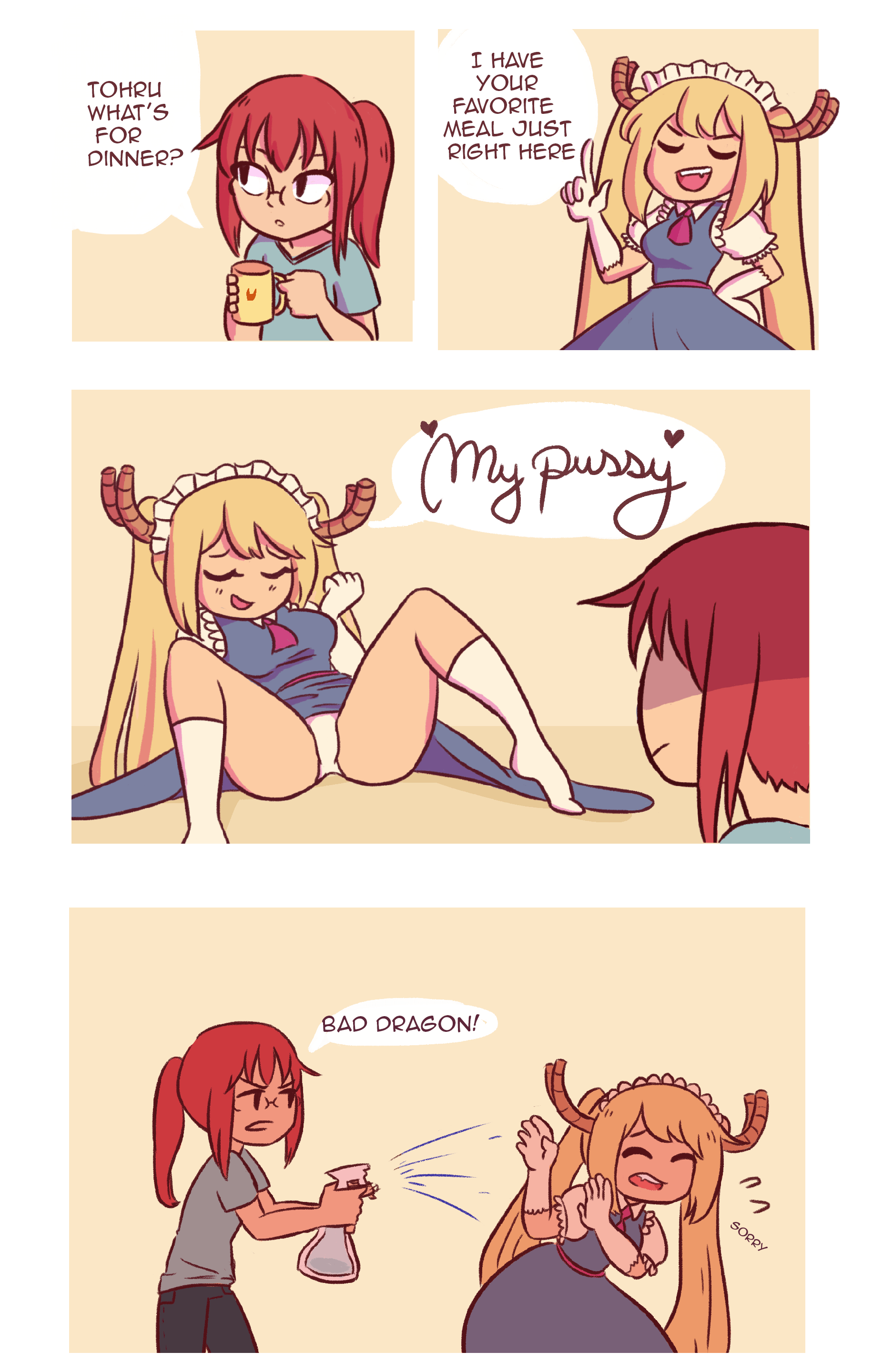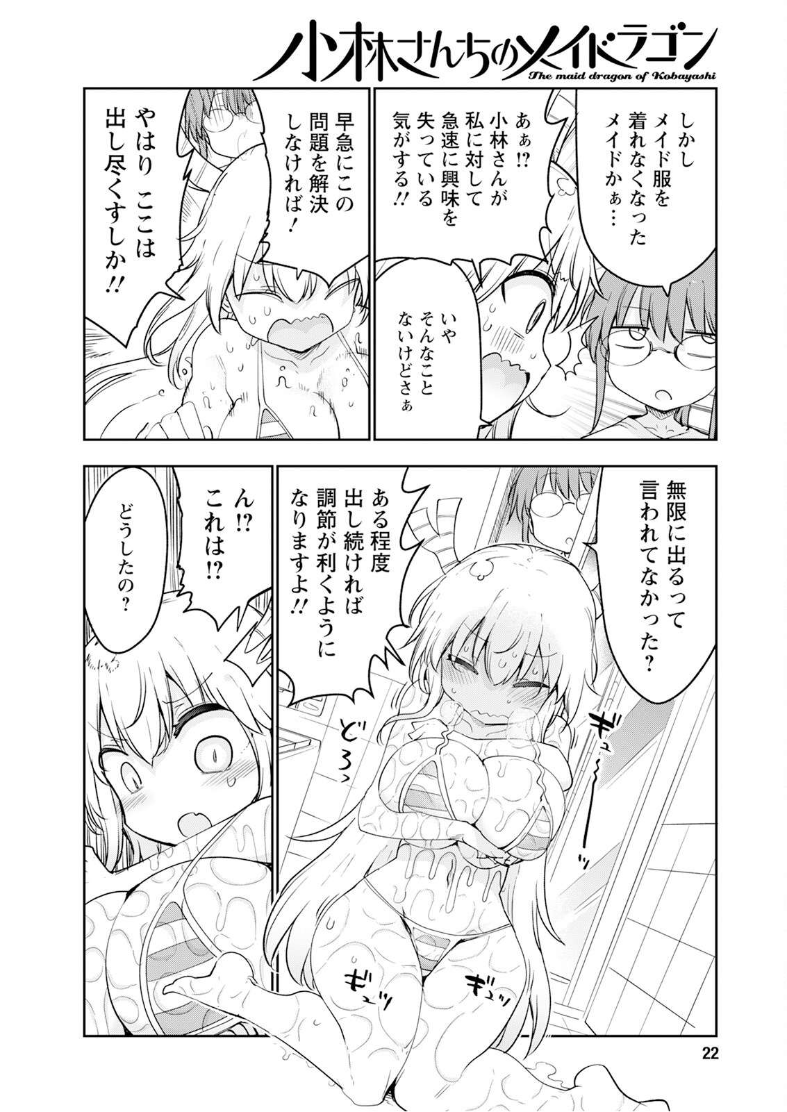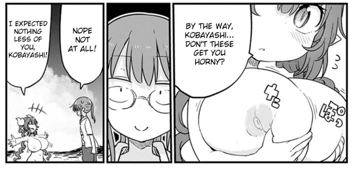>>287313308Kobayashi: But a maid who can't wear her maid outfit anymore, huh...Tohru: AHH! I FEEL LIKE KOBAYASHI-SAN IS RAPIDLY LOSING INTEREST IN ME!!Kobayashi: That's not true though.Tohru: I NEED TO RESOLVE THIS ISSUE QUICKLY!Tohru: LOOKS LIKE I HAVE NO CHOICE BUT TO LET IT ALL OUT!!Kobayashi: Weren't you told it comes out infinitely?SFX: SQUELCH, GRIT, SQUEEZE (and another one I can't translate)Tohru: IF YOU KEEP LETTING IT OUT TO A CERTAIN EXTENT, YOU'LL BE ABLE TO CONTROL IT!!Tohru: MM!! WHAT IS THIS!?Kobayashi: What's wrong?