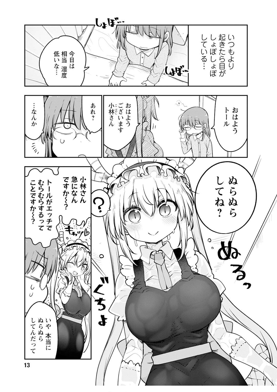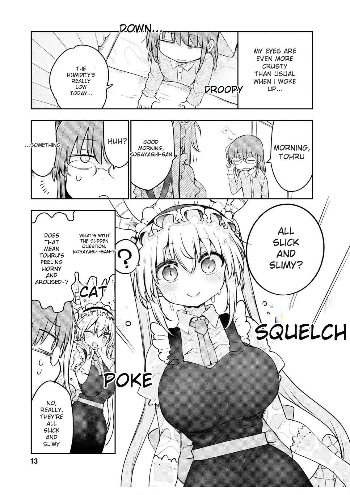 >>287313060Kobayashi: My eyes were even more crusty than usual when I woke up...Kobayashi: The humidity's really low today...Kobayashi: Morning, TohruTohru: Good morning, Kobayashi-sanKobayashi: Huh?Kobayashi: Something...Kobayashi: All slick and slimy?Tohru: ?SFX: SQUELCH, POKE(Translation for the second sfx is probably wrong)Tohru: What's with the sudden question, Kobayashi-san? Does that mean Tohru's feeling horny and aroused~?SFX: CATKobayashi: No, really. They're all slick and slimy