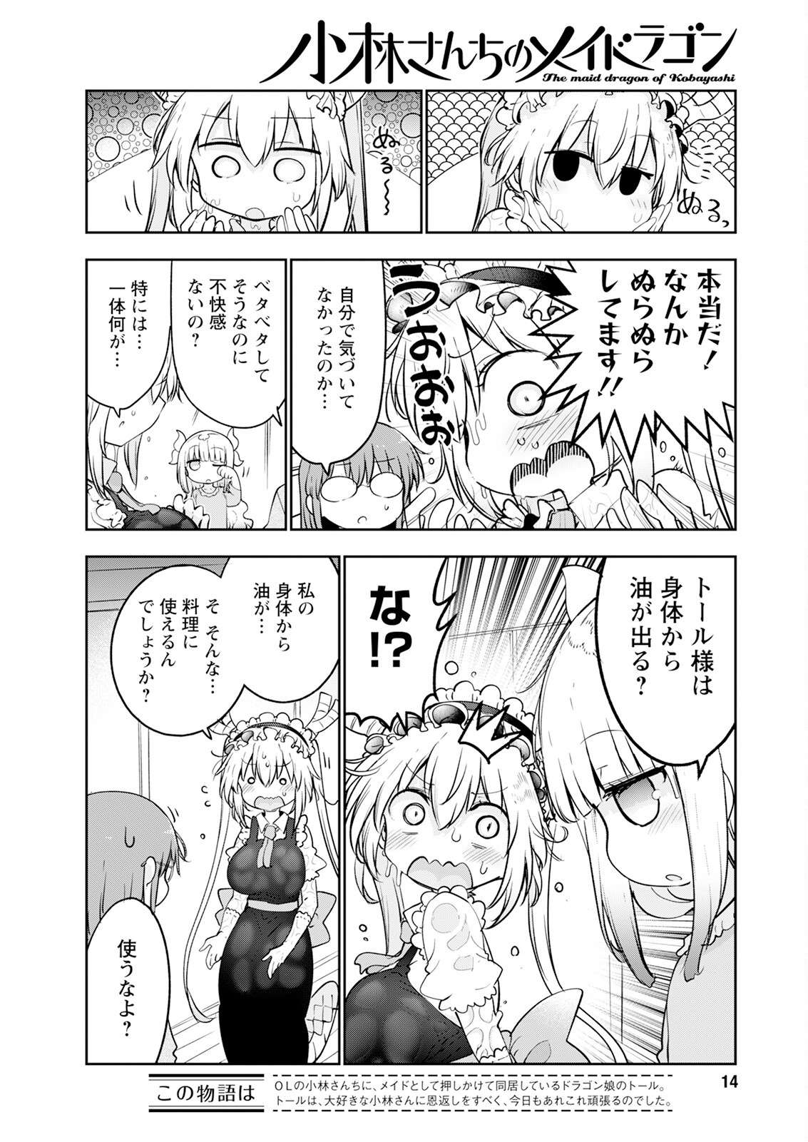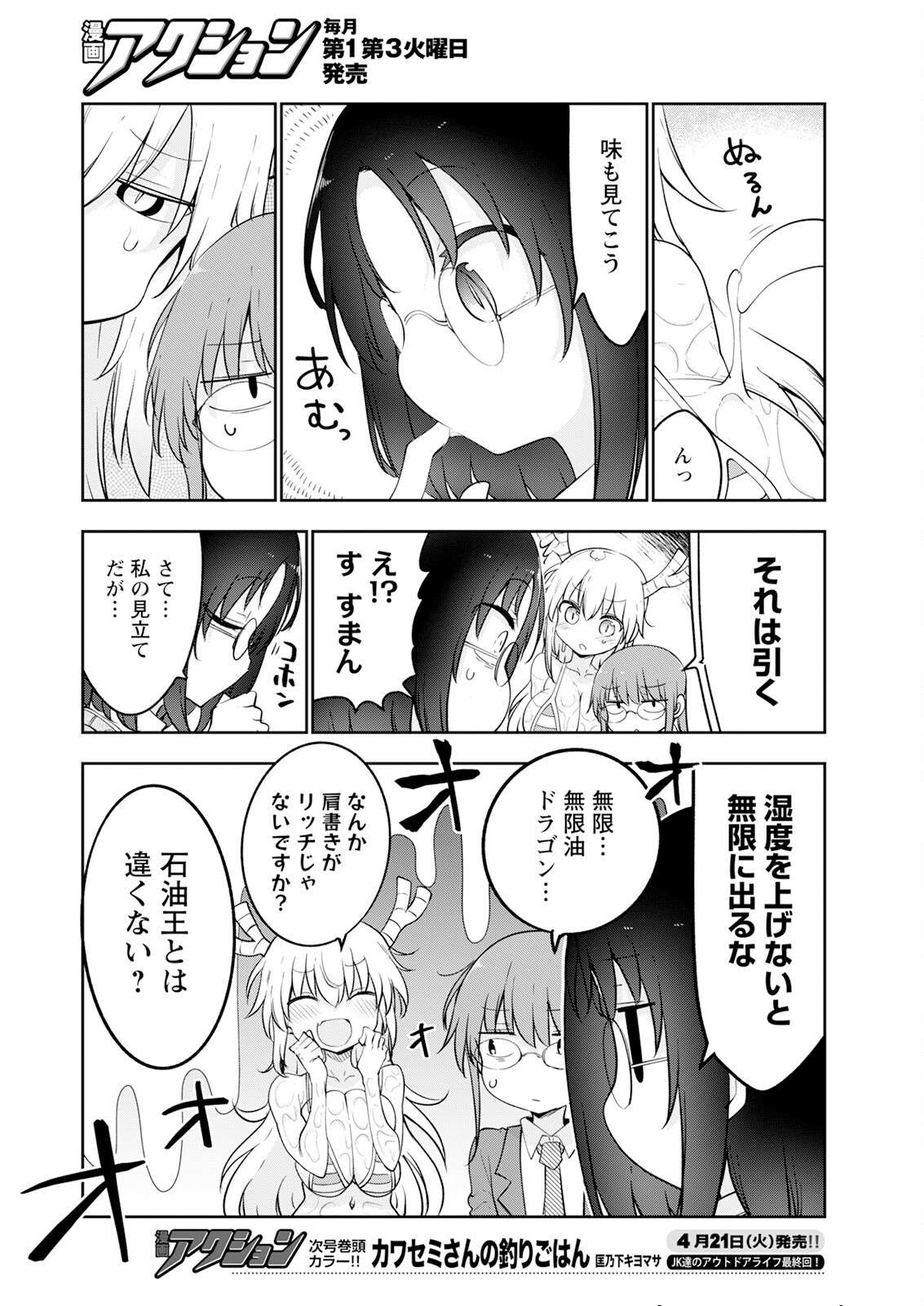 >>287313189SFX: SQUELCHTohru: NghElma: Let's check out the taste tooSFX: NOM!Kobayashi: That's a turn-off(Tohru might also be saying this but that's a weird bubble)Elma: EH!? SORRYSFX: COUGH COUGHElma: Now... My assessment is...Elma: Gotta raise the humidity or it'll keep coming out endlesslyKobayashi: Infinite... Infinite oil dragon...Tohru: Your title sounds pretty loaded, doesn't it?SFX: OOOOO (I guess it's an 'ooooh!')Elma (presumably): Not the same as an oil tycoon?(JKs' Outdoor Life is ending next issue)