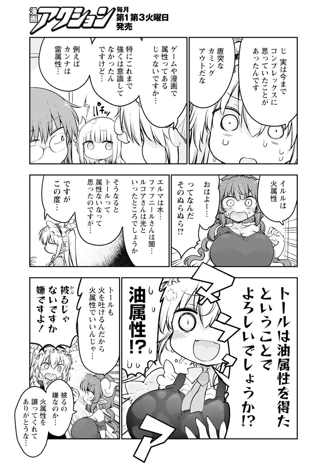 >>287313102Tohru: Actually, there was something I've been feeling complex about until now.Kobayashi: That's a sudden coming out.Tohru: You know how games and manga have attributes, right... I haven't really been conscious of it strongly until now, but... For example, Kanna is lightning attribute...Tohru: Ilulu is fire attribute.Ilulu: G'morning... What the heck is that slimy thing!!Tohru: Elma is water... Fafnir is darkness... Lucoa is light, something like that? So then I thought, Tohru doesn't have an attribute, right... But this time...Tohru: SO, IT'S OKAY TO SAY THAT TOHRU HAS ACQUIRED THE OIL ATTRIBUTE??Kobayashi (presumably): OIL ATTRIBUTE!?Ilulu: Tohru can breathe fire too, so fire attribute is fine, isn't it...Tohru: THEY'RE OVERLAPPING, RIGHT? I HATE THAT!Ilulu: She hates overlapping... Thanks for yielding the fire attribute...