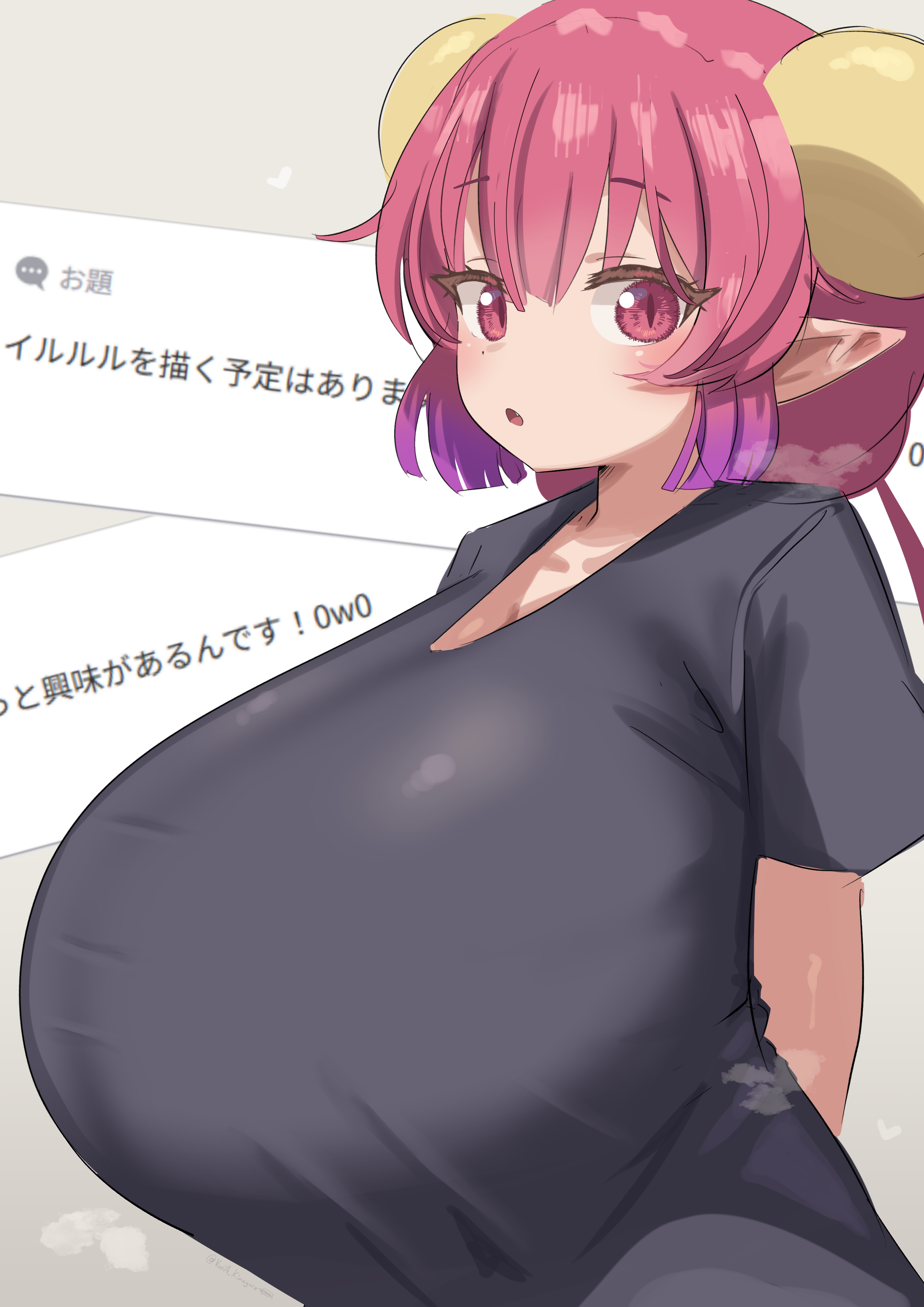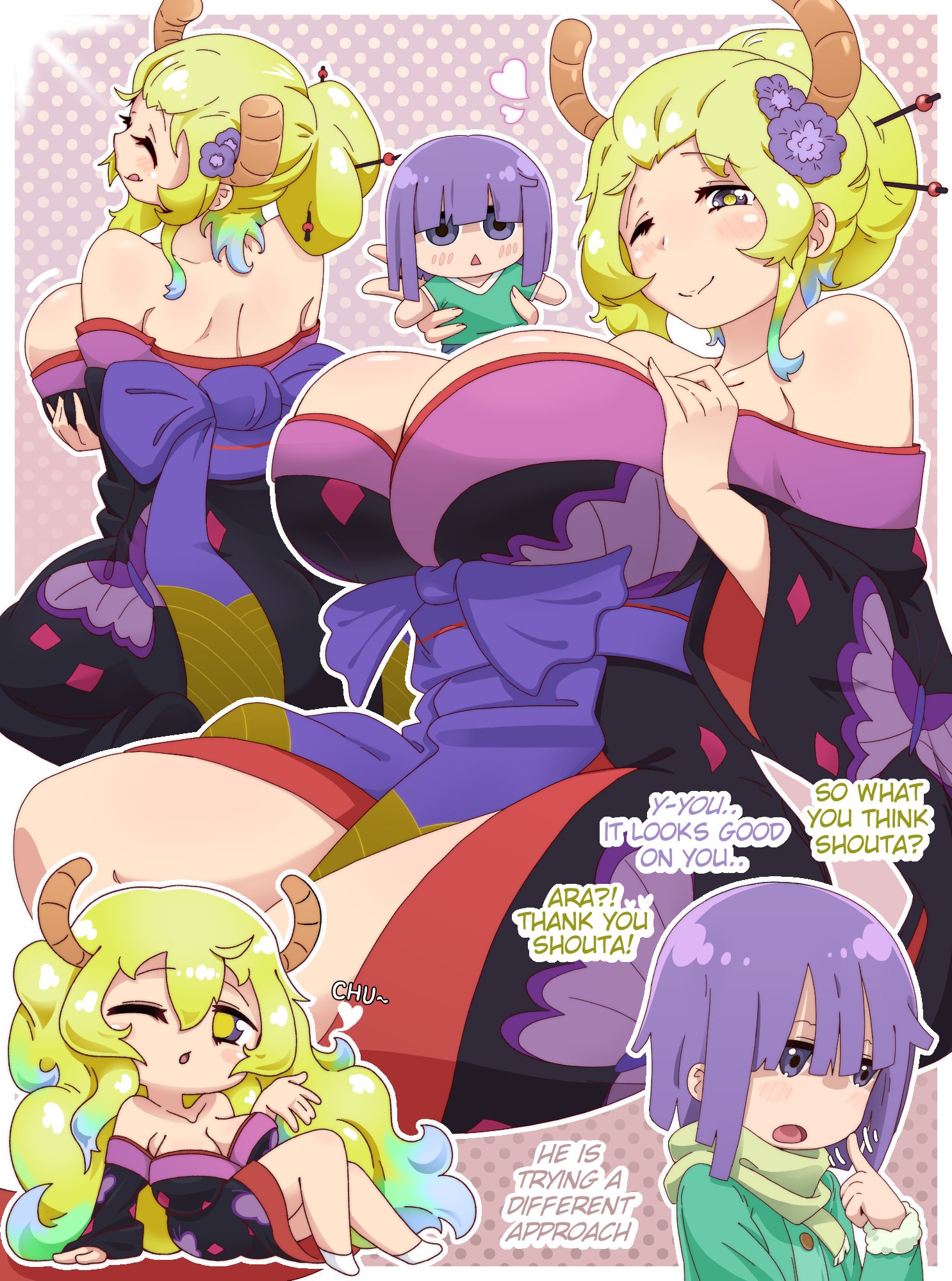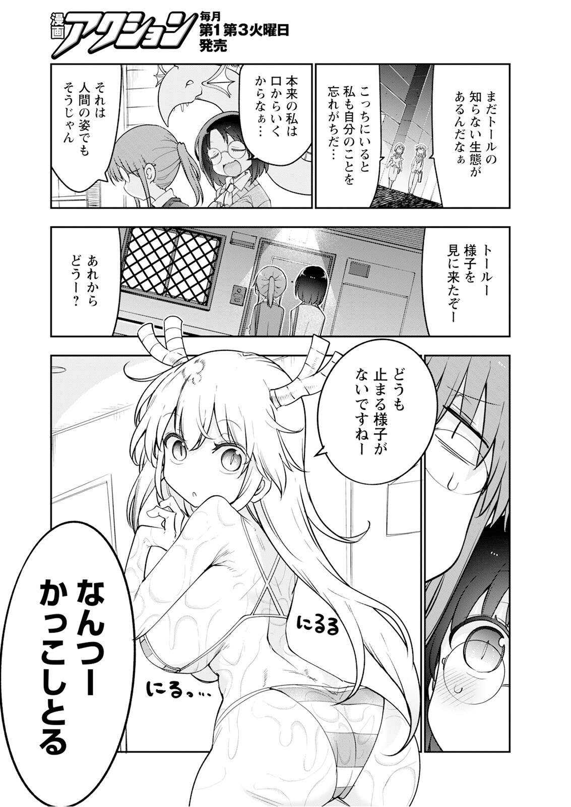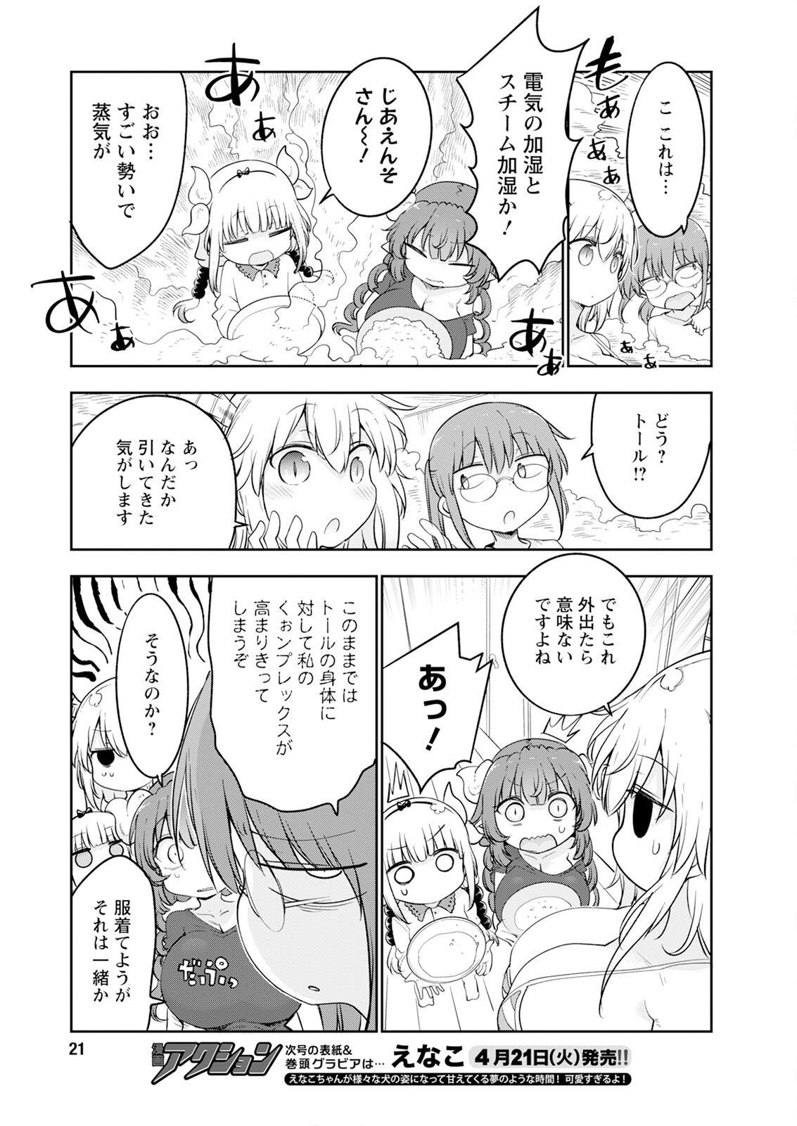 >>287313285Kobayashi: T-this is...SFX: CHIFA (a reference to the Chinese/Peruvian culinary tradition, I assume)Kobayashi: Electric humidification and steam humidification, huh!Kanna: Chia Enso-san (no idea)Kobayashi (presumably): Woah... the steam is coming out with amazing forceSFX: AAAAAA (unsure if it's meant to be like 'ahhh' or the sound of rice cooking)Kobayashi: How is it? Tohru??Tohru: Ah, somehow I feel like it's pulling backTohru: But if we go out like this, it won't make any difference, right?Ilulu, Kanna: AH!Kobayashi: If this keeps up, my complex about Tohru's body will reach its peak!Ilulu: Is that so?Kobayashi: That's itKobayashi: Whether you're wearing clothes or not, it's the same thing, huh(The next issue's cover model will be Enako, acting cute and clingy as she 'turns into various dog forms', if that's what lubricates your dragon)