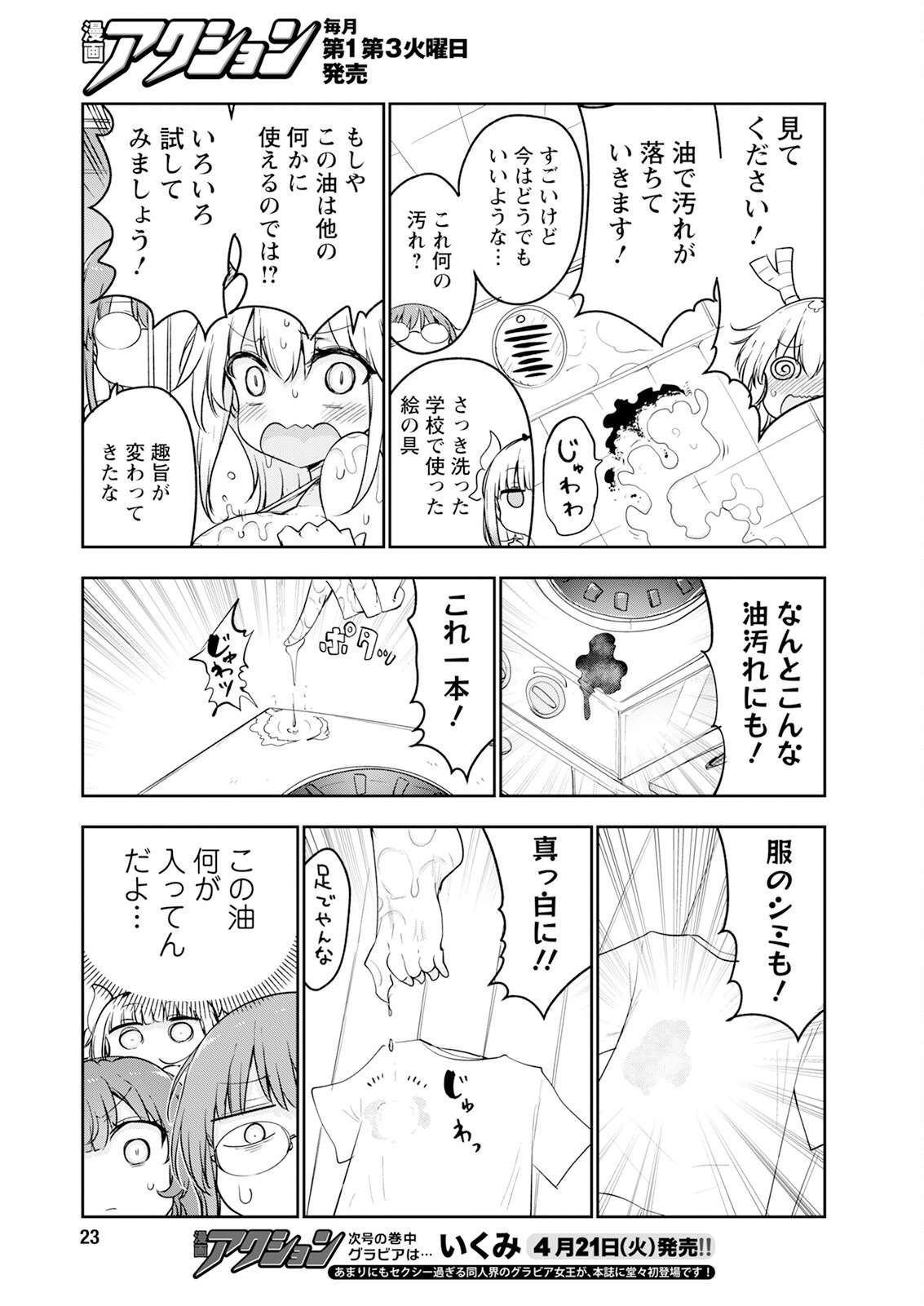 >>287313342Tohru: LOOK AT THIS! THE STAINS COME OFF WITH THE OIL!SFX: SIZZLEKobayashi: Amazing, but right now it's kinda irrelevant... What kind of stain is this?Kanna: The paint I used at school that I just washed earlierTohru: COULD THIS OIL BE USEFUL FOR SOMETHING ELSE!? LET'S TRY OUT A BUNCH OF DIFFERENT THINGS!Kobayashi: This is getting off trackTohru: AMAZINGLY, IT WORKS ON OIL STAINS TOO!Tohru: JUST ONE BOTTLE!(could also be 'drop', can't translate the right sfx)SFX: SIZZLETohru: CLOTHES STATINS TOO!Tohru: COMPLETELY WHITE!!SFX: SIZZLEKobayashi: That's crazyKobayashi, Kanna, Ilulu: What the heck is in this oil...(Gravure model Ikumi will appear in the next issue for the first time, the mention of fashion and doujin would suggest cosplay?)