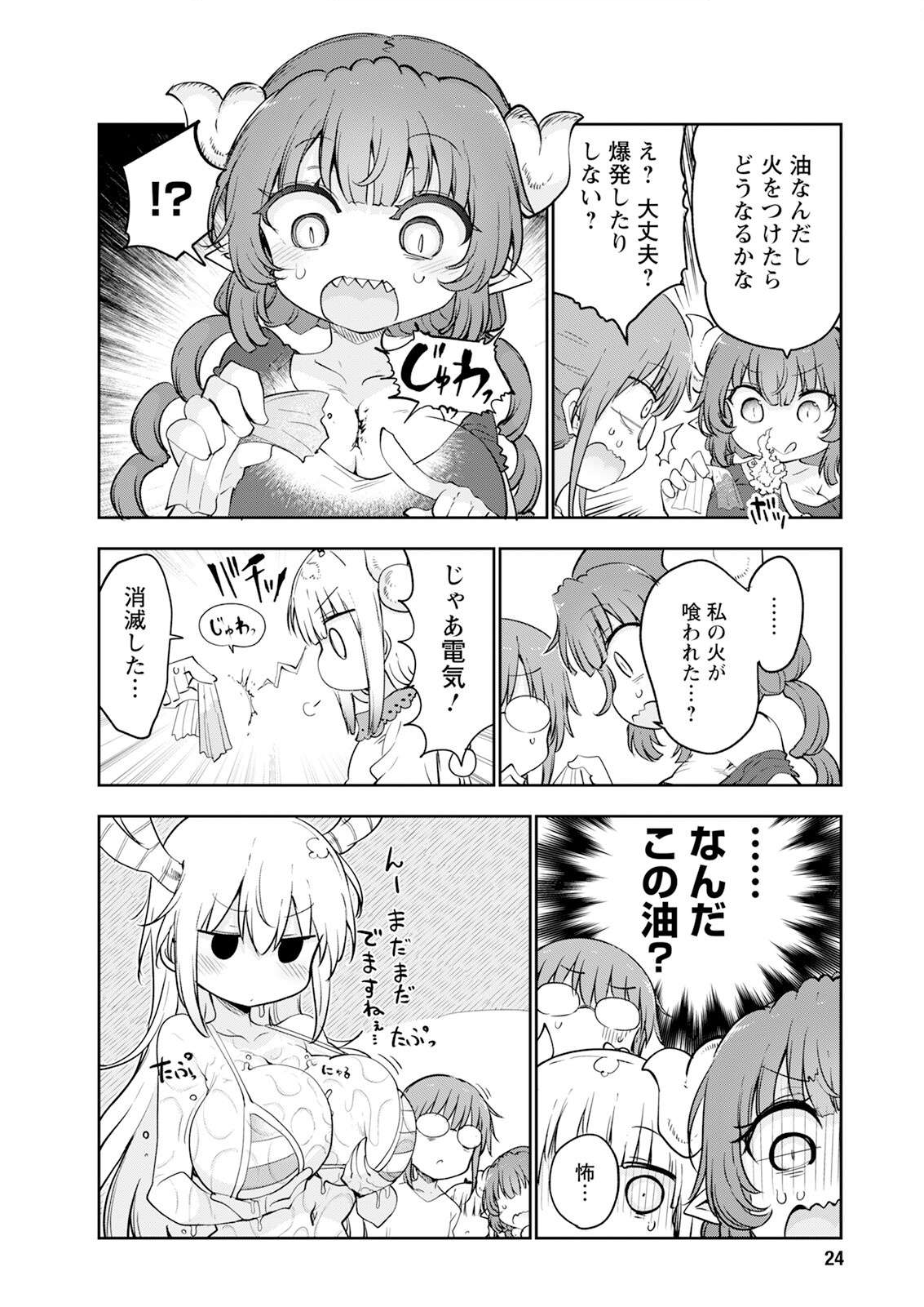 >>287313361Ilulu: It's oil, so I wonder what'll happen if I light it on fireKobayashi: Huh? You okay? It won't explode or anything?SFX: BOOBSIlulu: !?(can't translate SFX)Ilulu: ...... My fire got swallowed...?Kanna (presumably): THEN ELECTRICITY!SFX: ZAP!, SIZZLE!Kanna: It vanished...Ilulu, Kobayashi, Kanna: ...... WHAT IS THIS OIL?Kanna: Scary...Tohru: Hmm, not yet. It's still coming out...SFX: POP!, SQUISH, DRIP