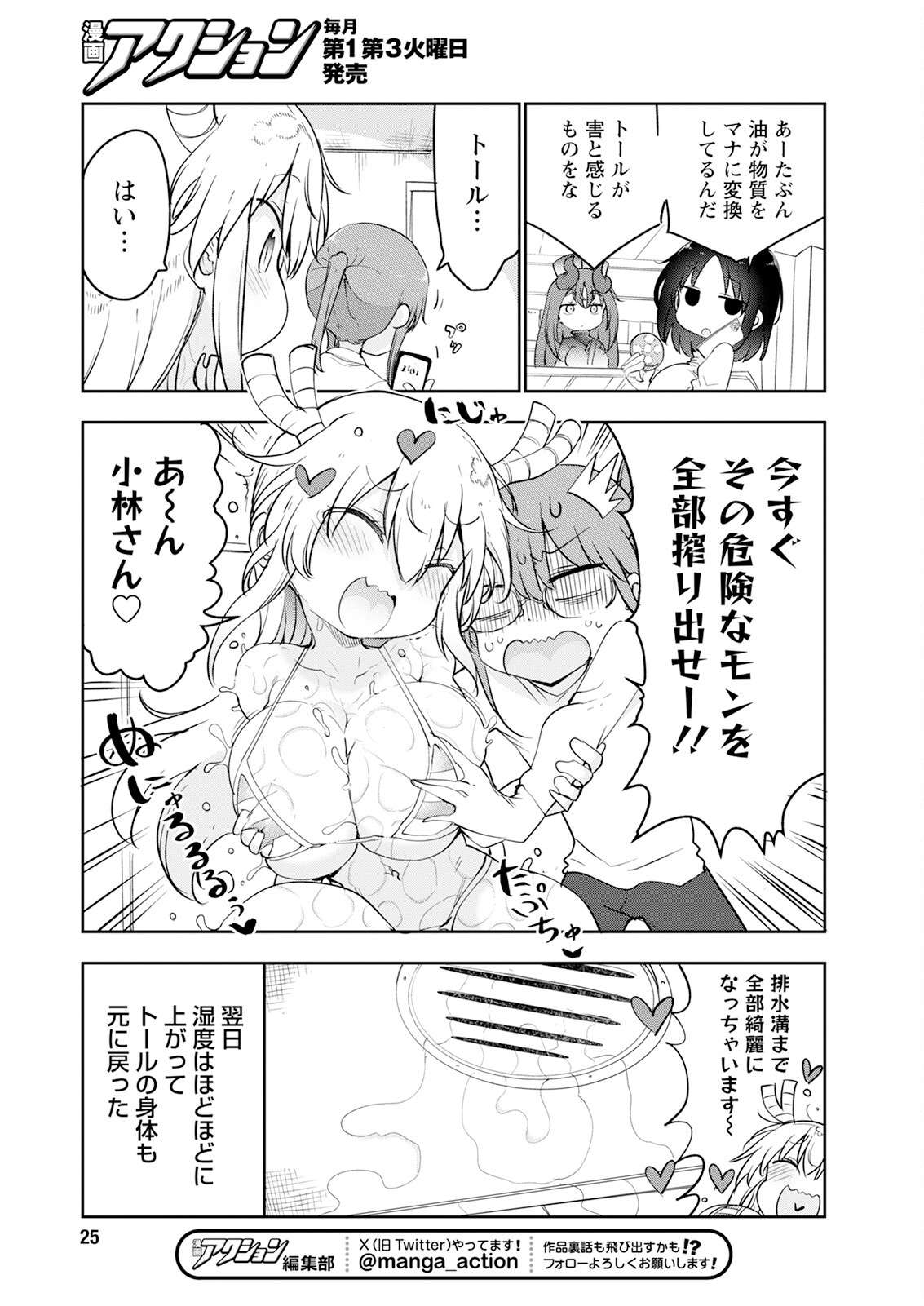 >>287313387Elma: Ah, the oil is probably converting the substances into mana. Things that Tohru perceives as harmful.Kobayashi: Tohru...Tohru: Yes...(can't get SFX, probably just Kobayashi tapping her phone screen)Kobayashi: SQUEEZE OUT ALL THAT DANGEROUS STUFF RIGHT NOW!!SFX: NYA! (I think?)Tohru: A-KUN KOBAYASHI-SAN (heart)SFX: PU CHUUU, NYURURURUU(I dunno, make up your own sfx for Tohru being groped by her wife)Tohru: Even the drain will get completely clean-Kobayashi: The next day, the humidity rose moderately and Tohru's body returned to normal.